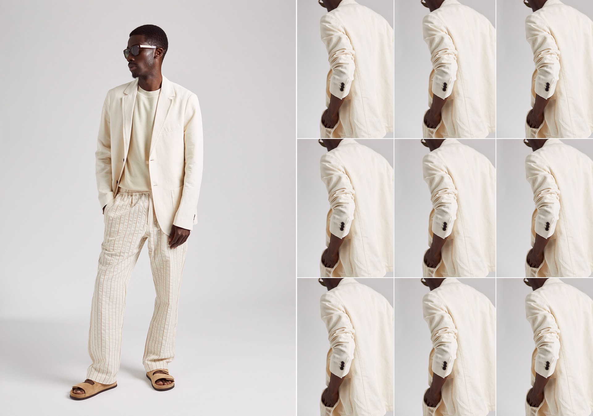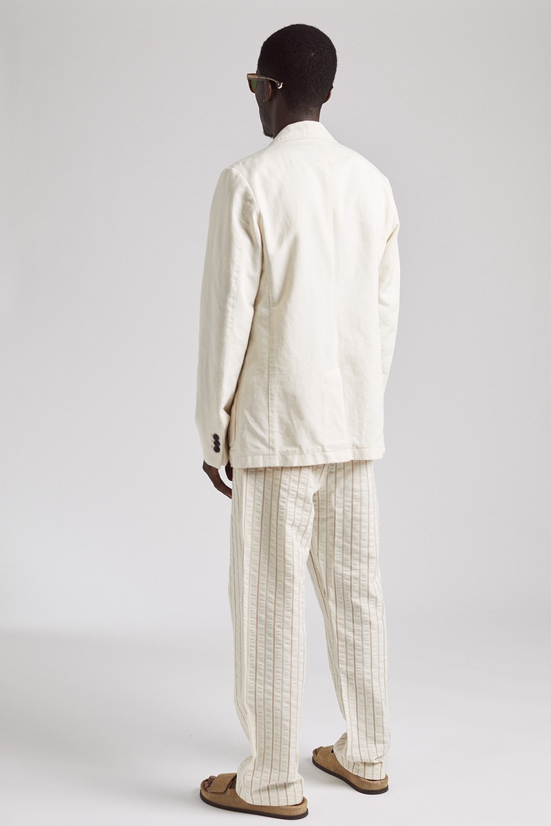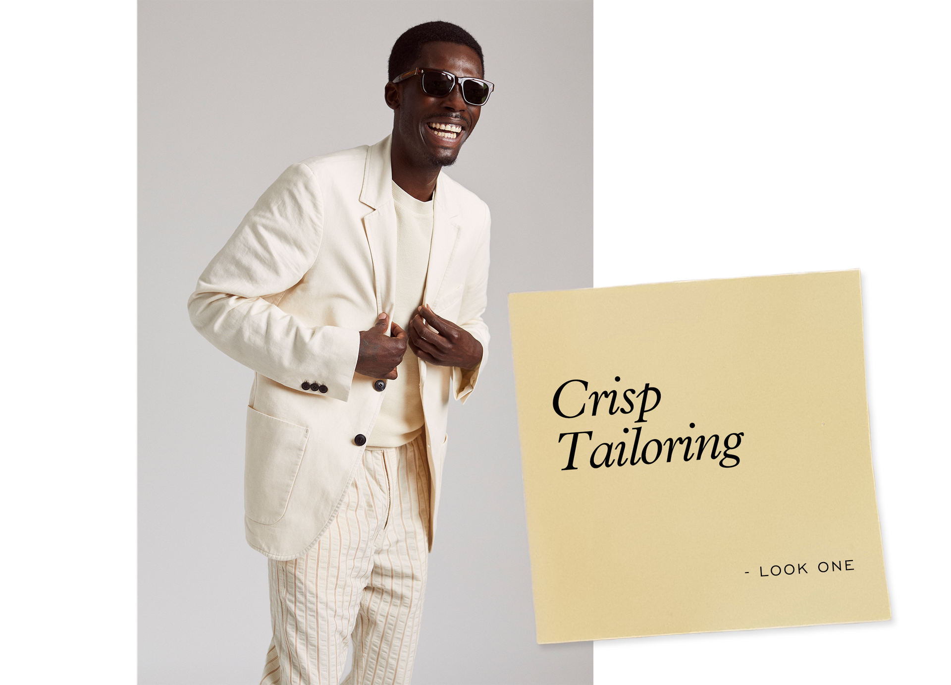 Honeycomb-Knit Cotton T-Shirt, £190 | Sunspel, White Sand Relaxed-Fit Textured Stripe Cotton Trousers, £295 | Orlebar Brown, Unstructured Cotton-Blend Suit Jacket, £365 | Sunspel, Officine Générale Square-Frame Tortoiseshell Acetate Sunglasses, £335 | Garrett Leight California Optical, Suede Slides, £89 | COS