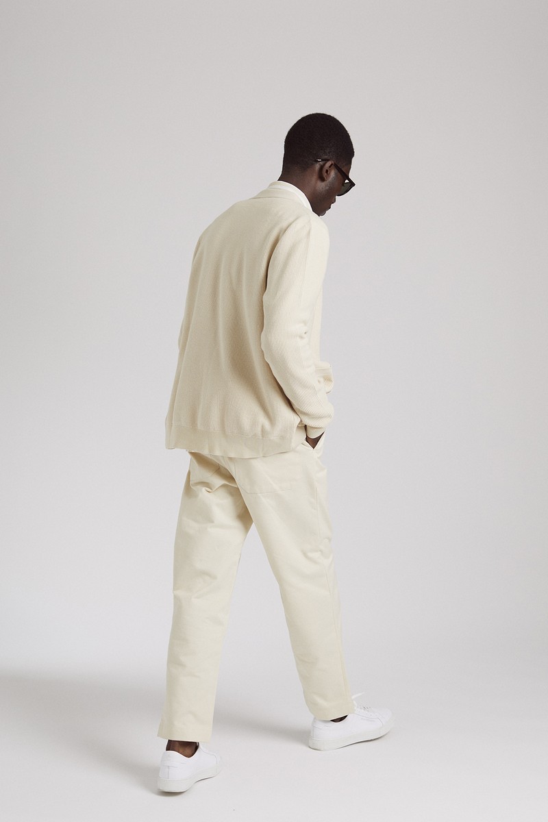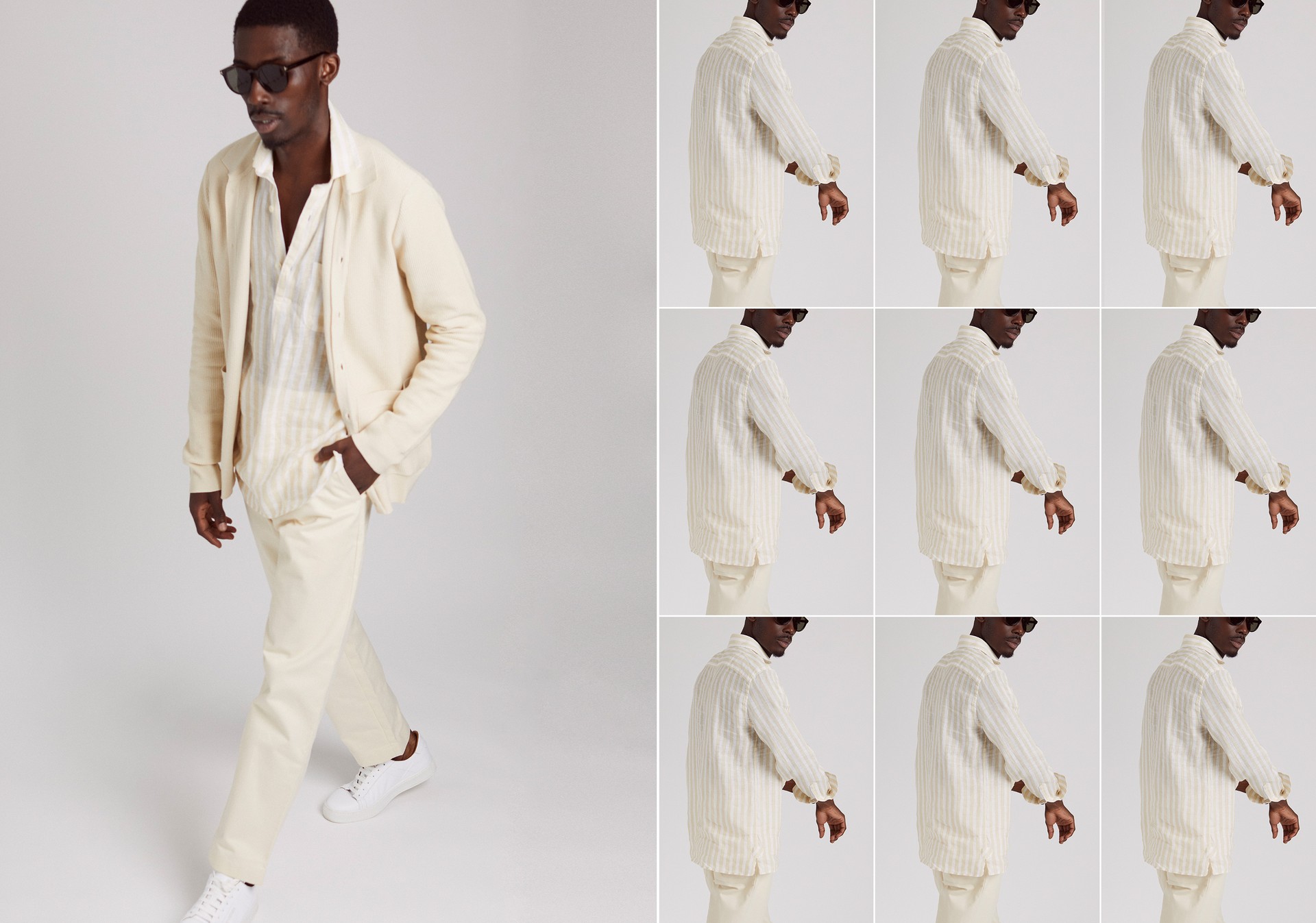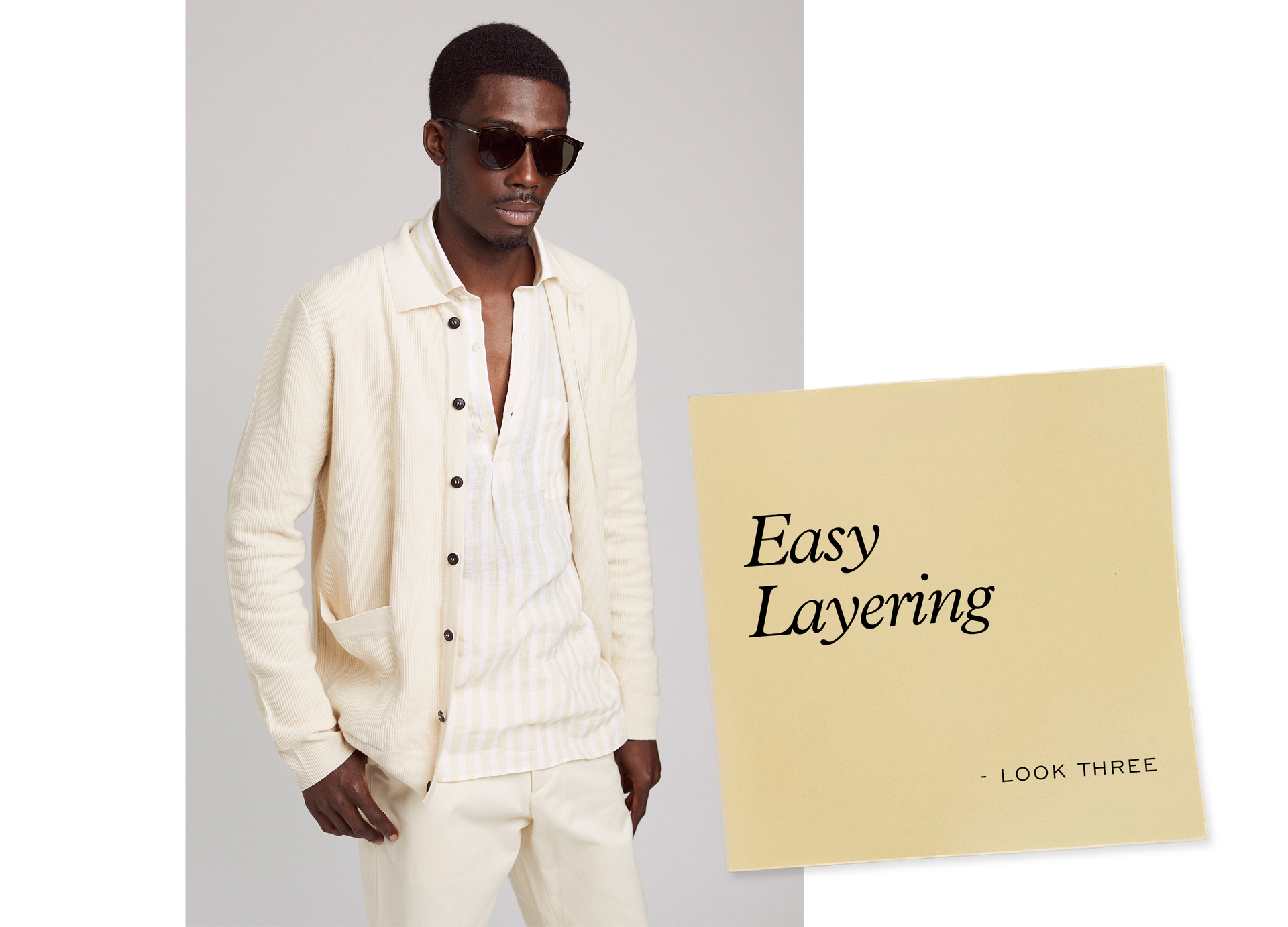 Honeycomb-Knit Cotton T-Shirt, £190 | Sunspel, White Sand Relaxed-Fit Textured Stripe Cotton Trousers, £295 | Orlebar Brown, Unstructured Cotton-Blend Suit Jacket, £365 | Sunspel, Officine Générale Square-Frame Tortoiseshell Acetate Sunglasses, £335 | Garrett Leight California Optical, Suede Slides, £89 | COS
