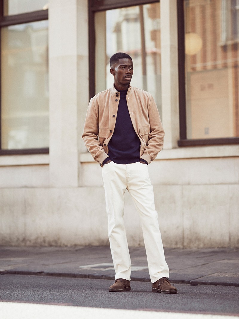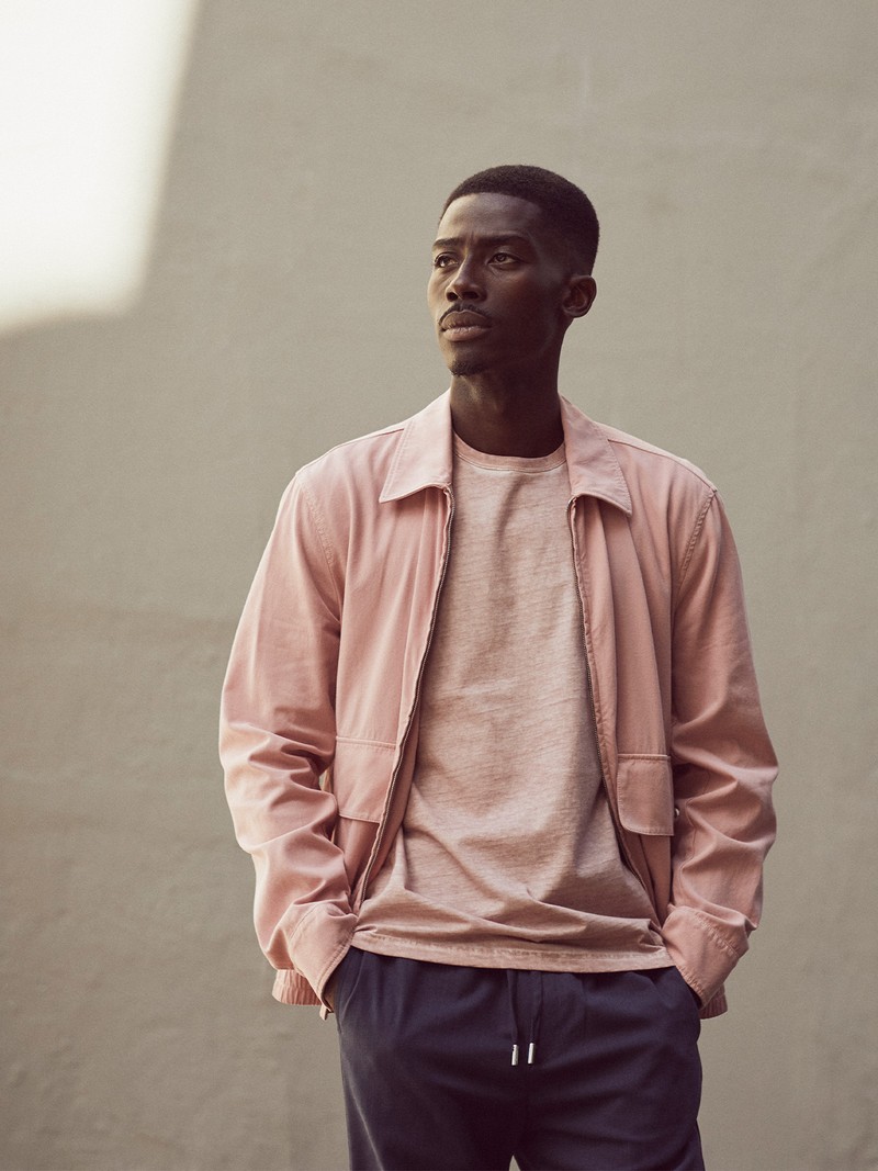 Light layers are a no brainer, but opting for salmon over navy or khaki just feels that bit cooler. Drawstring trousers and some crisp white trainers complete the look.