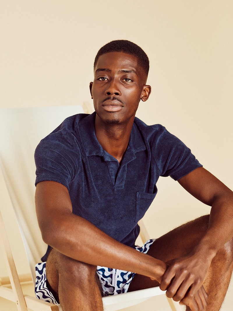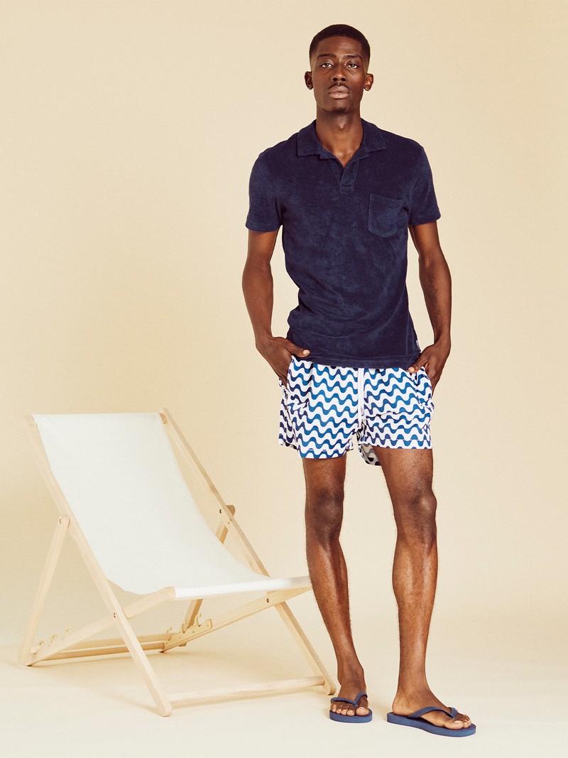 This towelling fabric polo takes an easy-to-wear staple and gives it a cooler edge. Just add a bold pair of printed swim trunks and flip flops.