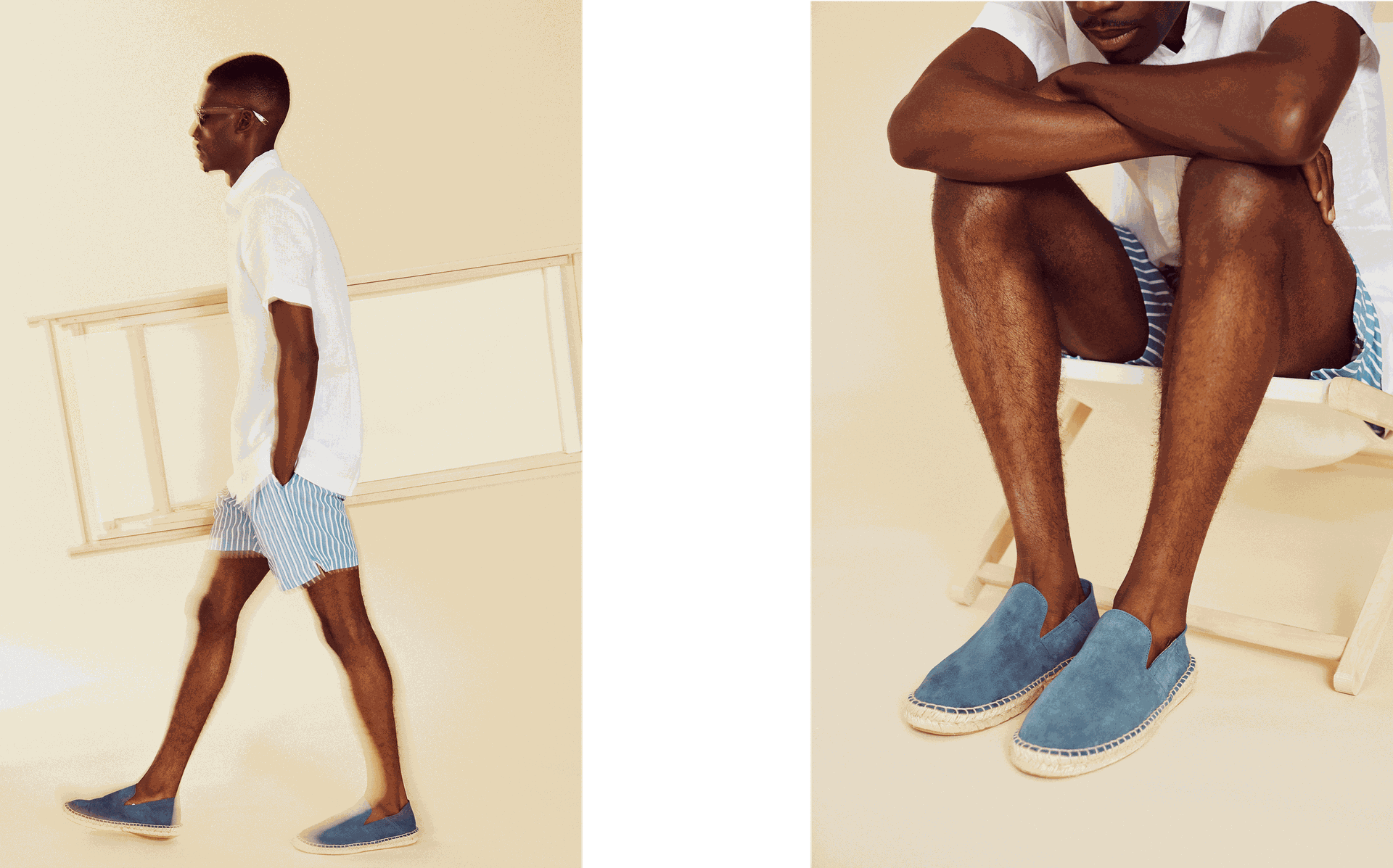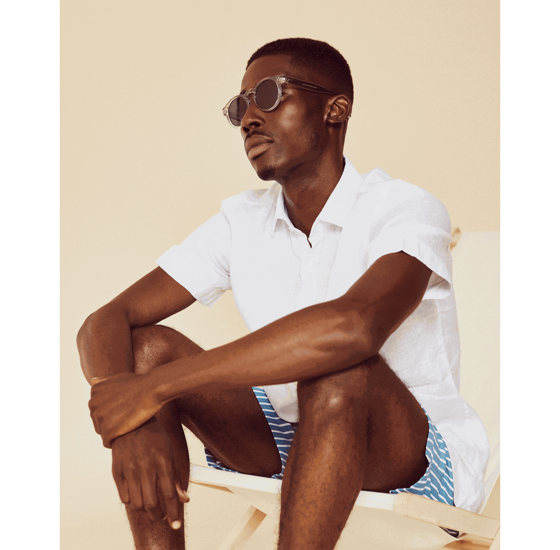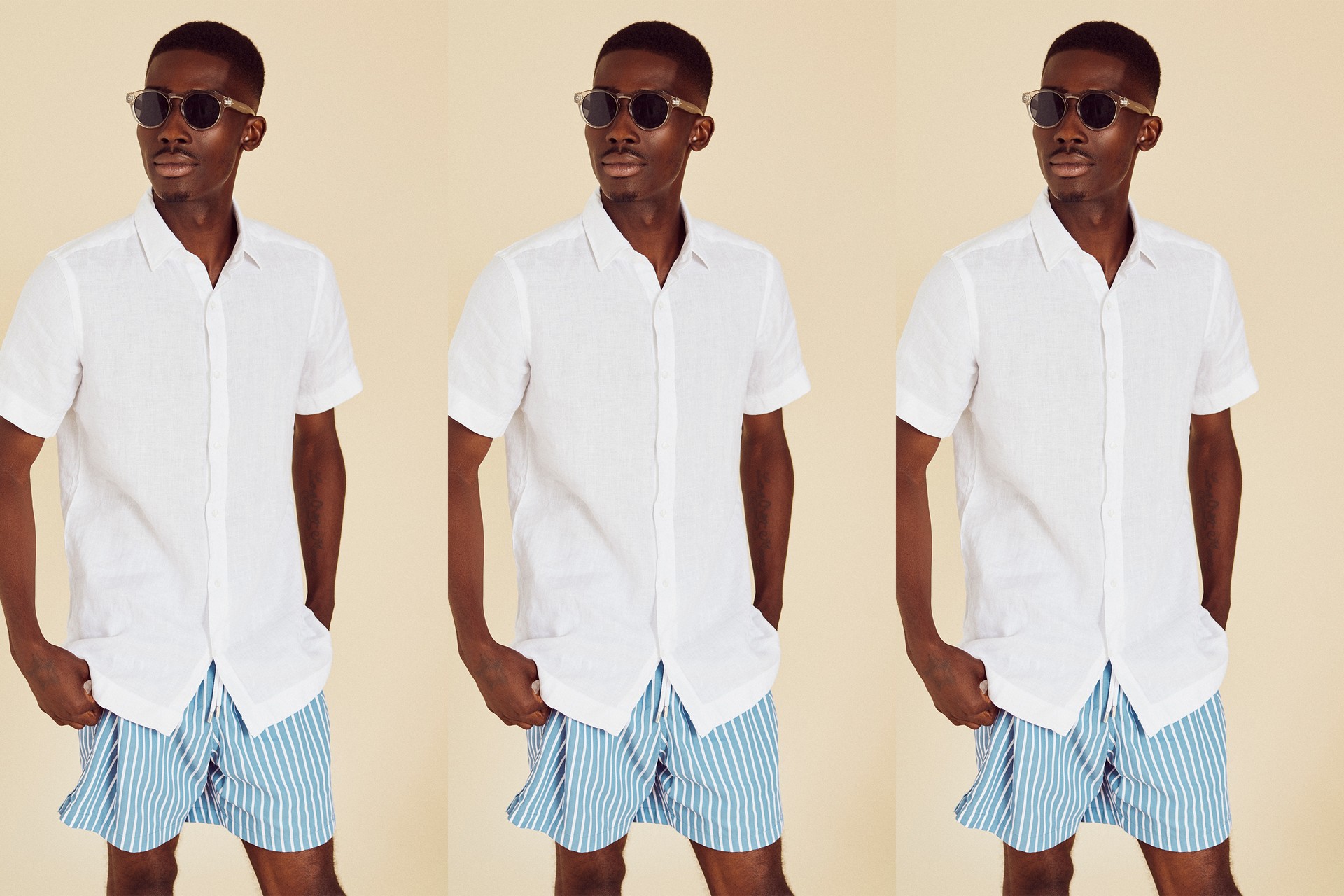 For the beach and beyond, a smart linen shirt gives fun swim shorts a more versatile edge. All-white Birkenstocks complete the look.
