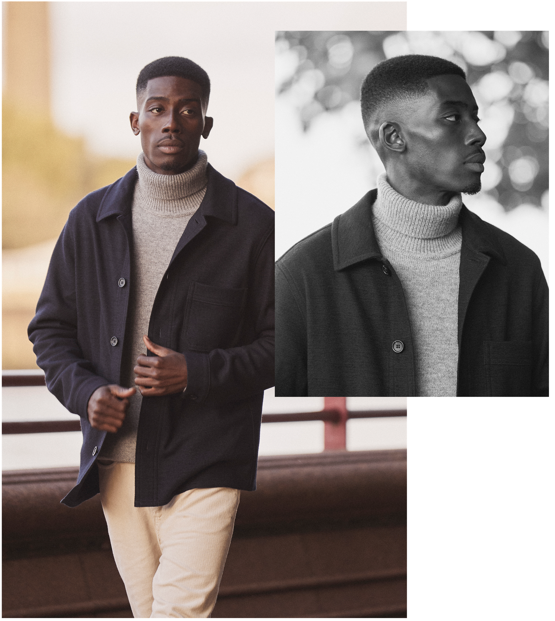 A shacket, grey knit and cords are a match made in heaven. From a smart-casual meeting to a dinner out, the soft wool and cotton jersey overshirt makes a stylish jacket on its own or works as an extra layer under coats.