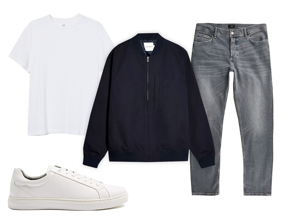 Clean, classic and simple, a white tee, jeans and trainers combo is failsafe. Add a navy bomber for a contemporary touch.