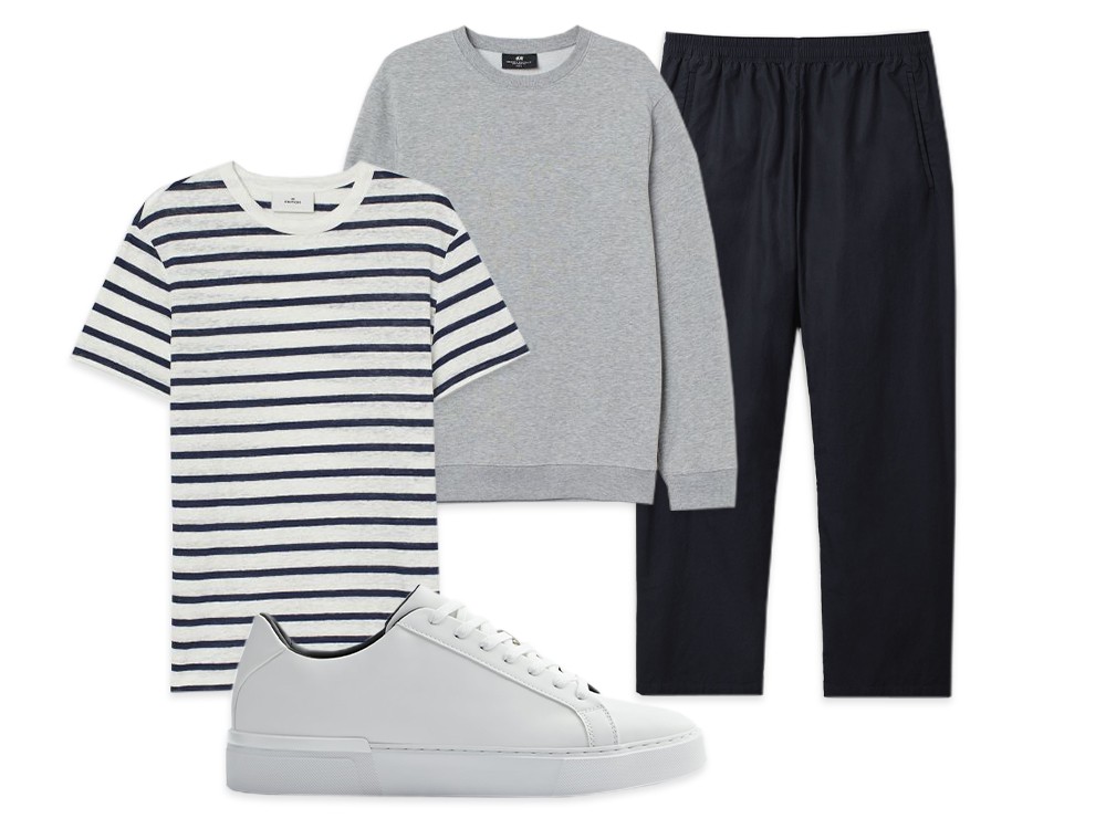 A stylish, off-duty look should be simple: think box-fresh trainers, relaxed trousers and crisp layers on top. A breton and grey sweatshirt are smart and comfy in equal measure.