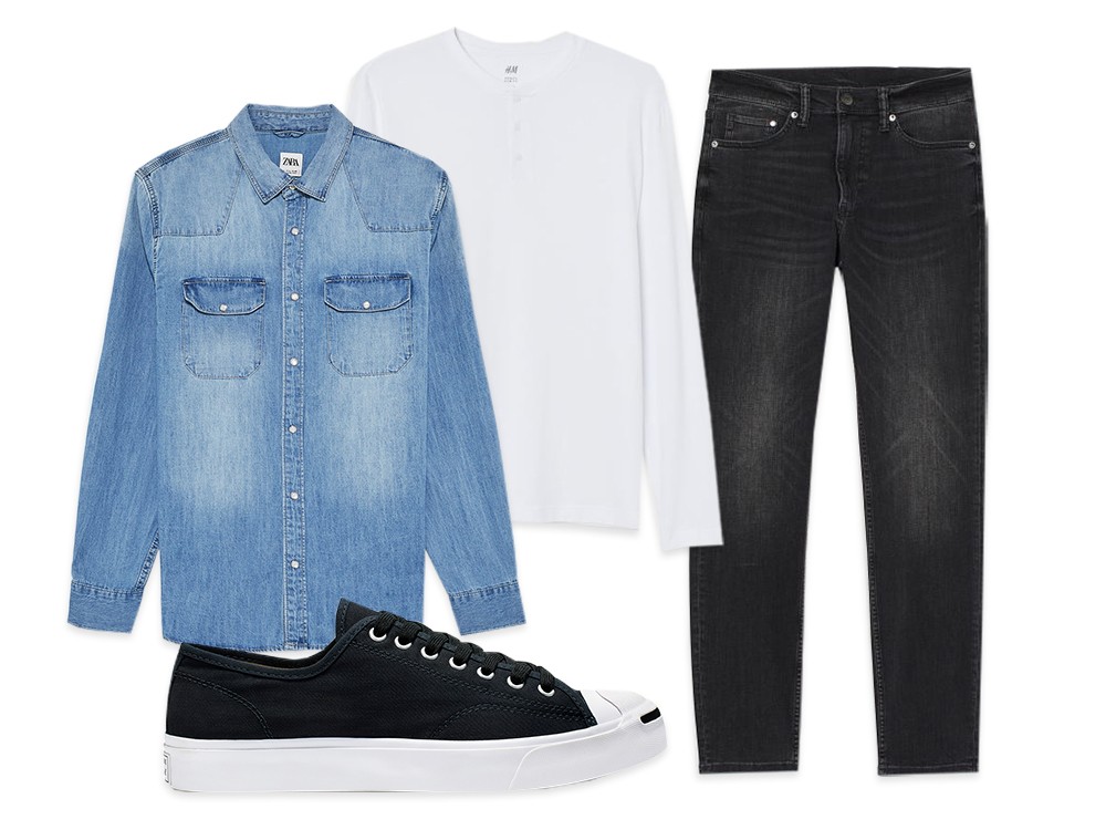 How to pull off double denim? Go for different shades. Check out this bright blue and black combo – layer over a henley to break up the look.
