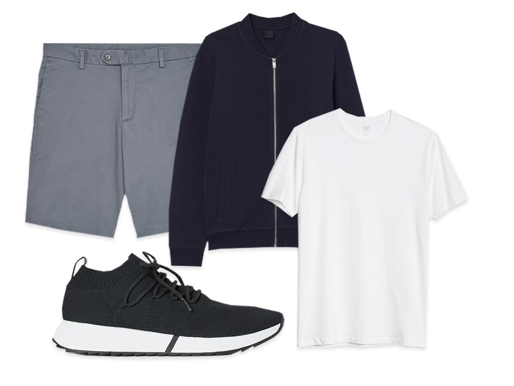 Elevate shorts and a tee by adding a smart bomber jacket and unfussy trainers. Sticking to a clean colour palette gives shorts a grown-up feel.