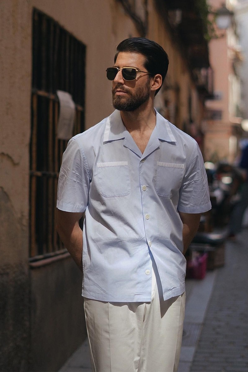 Short-sleeve co-ords are well established as the no-effort-needed way to look put together. There are PJ-inspired silk sets for braver sorts to explore, but also some less overt options – like a linen shirt and trouser, or this COS combo in an interesting blue shade. To give a printed set a laid-back feel, wear the shirt open with a white tee underneath, then add a cap and Birkenstock Arizonas.