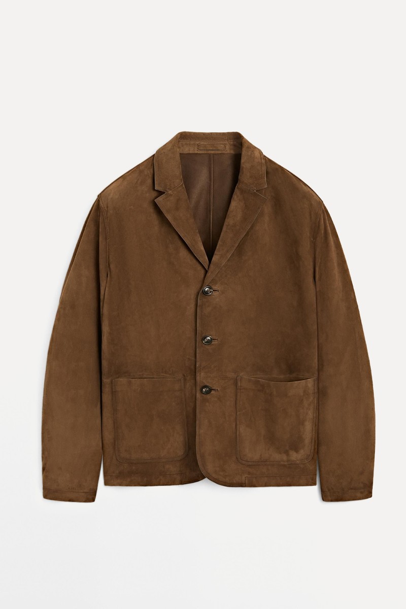 When it hits, there is almost nothing as cool as a suede jacket. This goatskin Massimo number has the silhouette and style bang on the money: stubby lapel, three-button closure and open pockets.