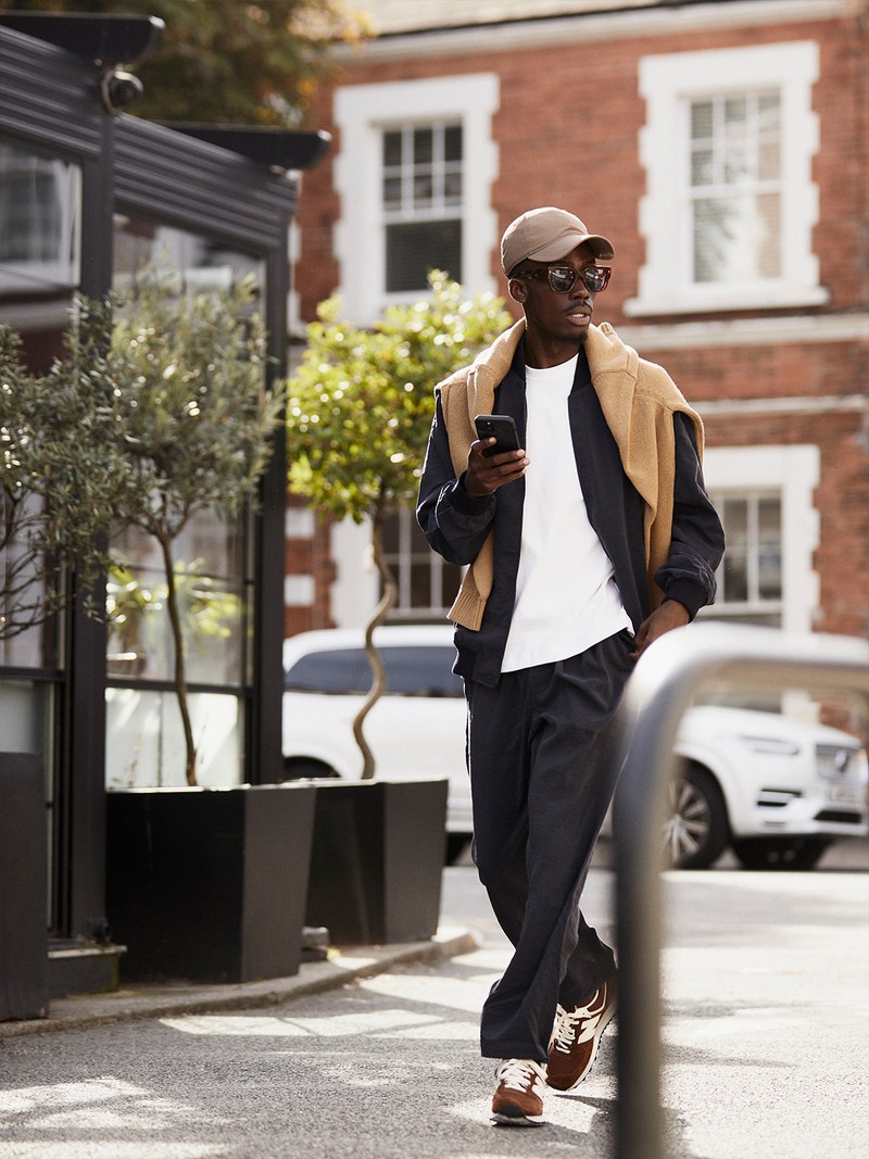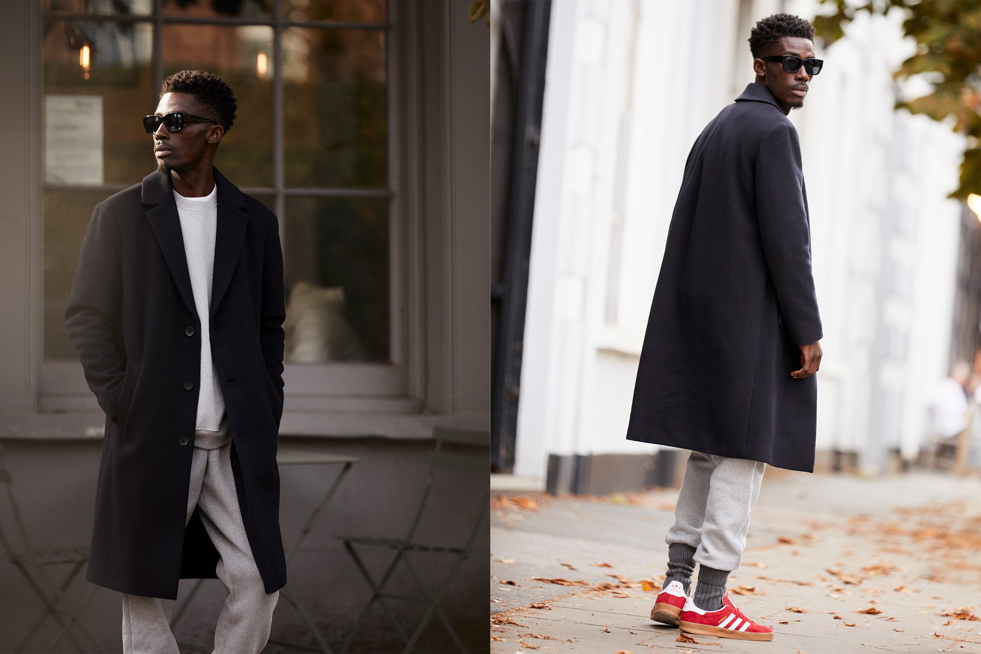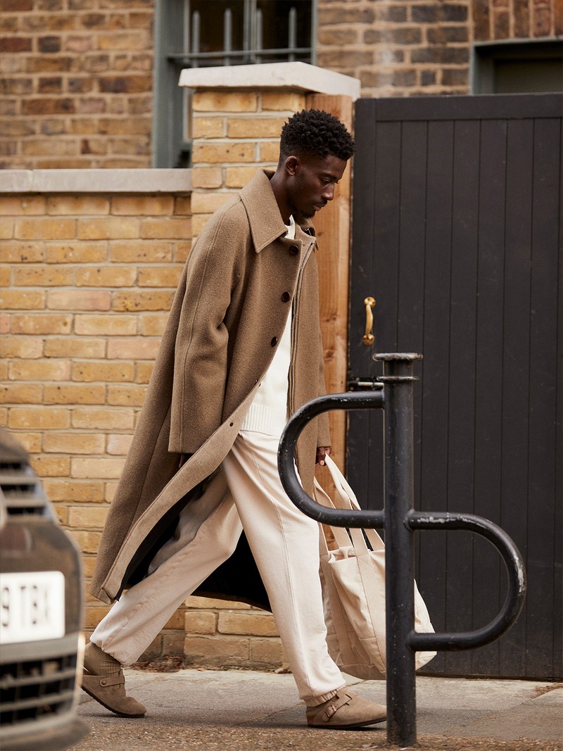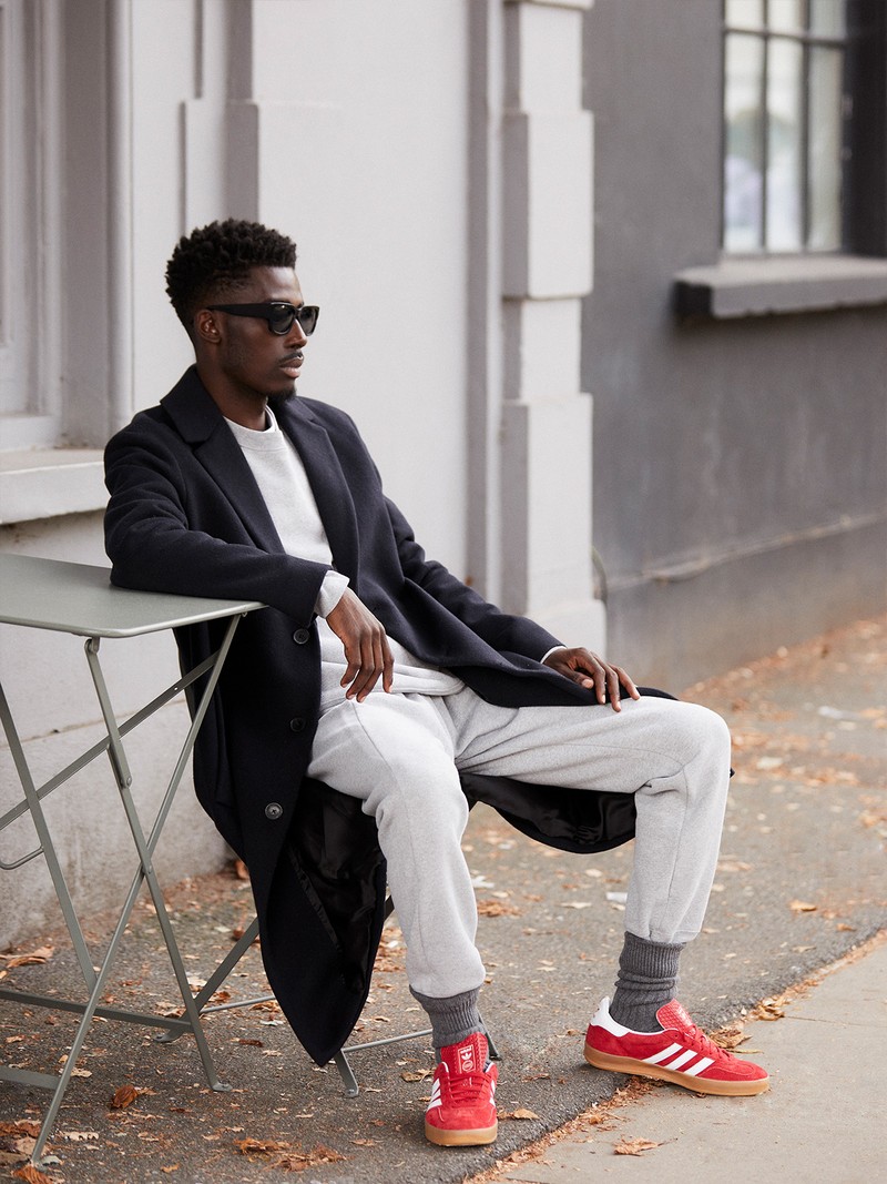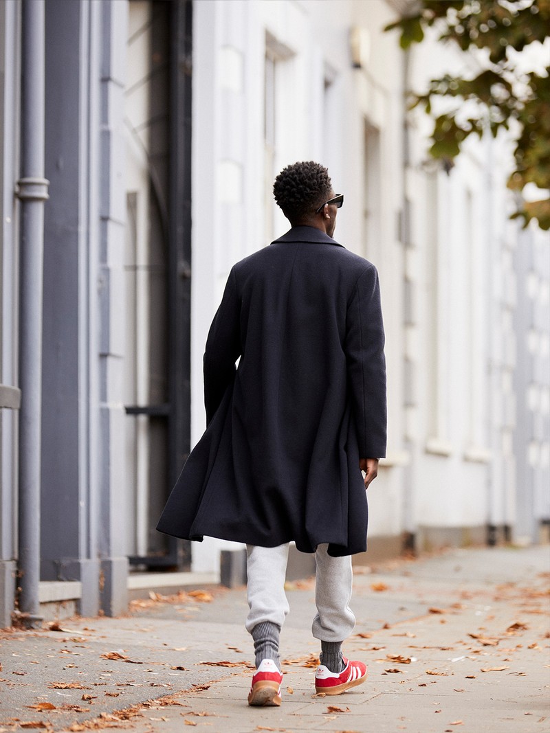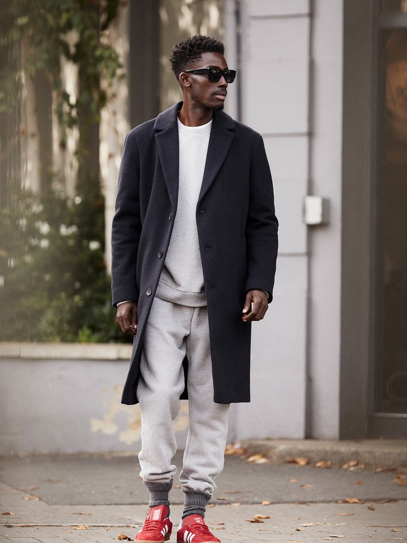 A tailored wool overcoat is the simplest way to elevate an everyday tracksuit. Go one or two sizes up with your coat for a cool, loose fit and team with chunky socks and retro trainers.