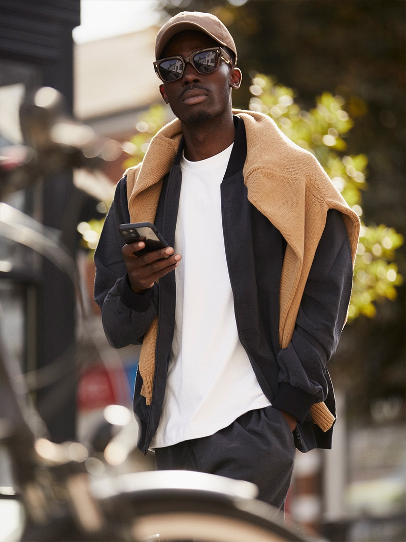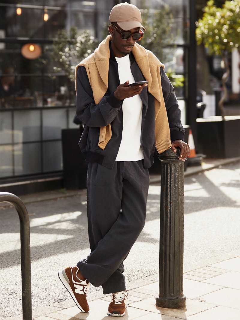 Basic Heavy Weight T-Shirt, £17.99 | Zara, Extra Fine Merino V Neck Jumper, £34.90 | Uniqlo, Silk Blend Bomber Jacket, £1,075 | SSam, Gathered-Waist Organic-Cotton Chino Trousers, £225 | Raey, 576 Suede & Mesh Trainers, £189 | New Balance, Canvas Cap, £130 | Our Legacy, Enzo Square Acetate Sunglasses, £680 | Jacques Marie Mage