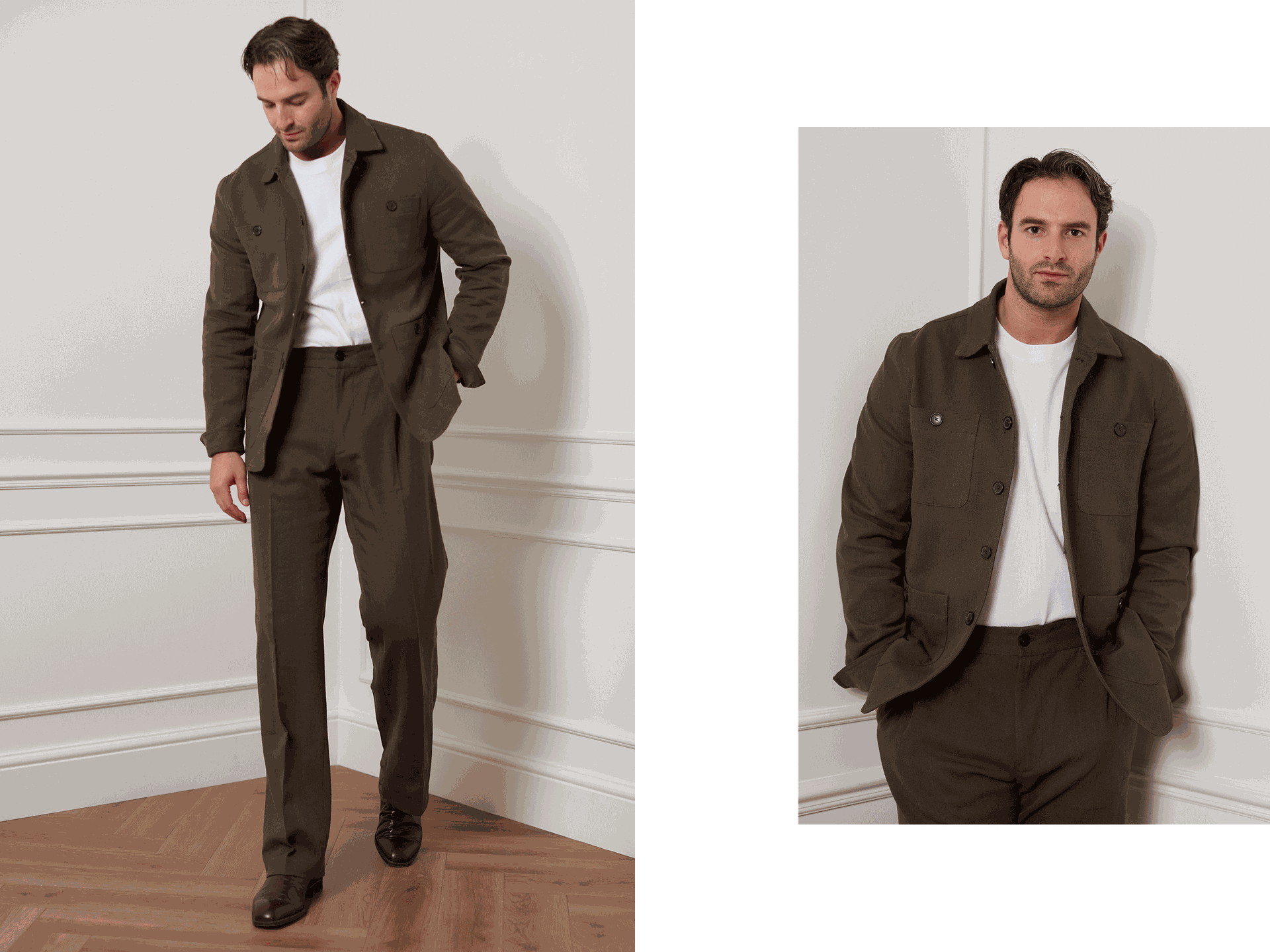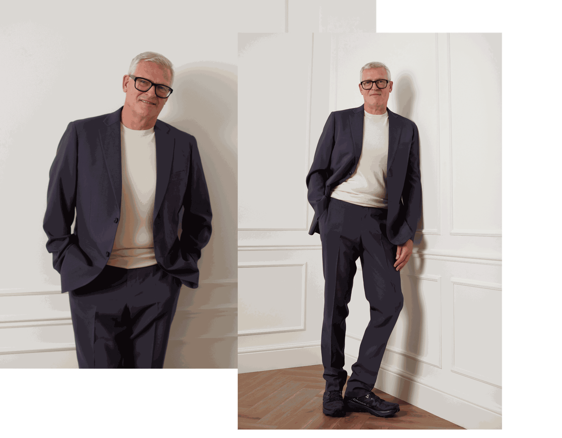 “When styling a suit, I often opt for a tee or polo shirt. I wouldn't usually go for this colour combination – navy with beige – but after playing around with it, I love the contrast. It’s ideal if you’re after a workwear option that can double up as a cool twist on leisure wear, too. The J+ suits are great, and I especially love that they’re cut slightly slimmer than regular Uniqlo. I’m also slightly obsessed with Salomon shoes and have a few pairs that I wear on repeat; with a suit, they add a bit of streetwear edge while still feeling subtle enough.”