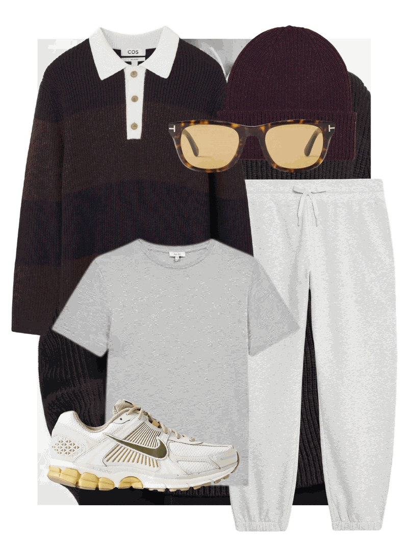 Joggers and trainers amplify the sporty vibe of a rugby shirt. Just don't try too hard – think less pitch-ready, more Sunday morning. A beanie in the same shade adds a bit more colour, while a puffer or wool coat is best for colder days.