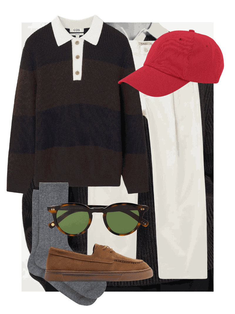 Chinos smarten up a laidback piece like a rugby shirt, while a red cap keeps adds a bit of off-duty edge. Suede loafers and decent shades are the finishing touches.