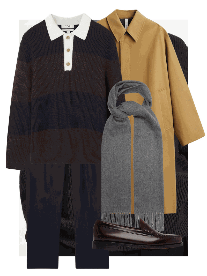 A more sophisticated take, trousers and brown loafers keep things feeling office-appropriate – depending where you work. Add a scarf and car coat to complete the look.