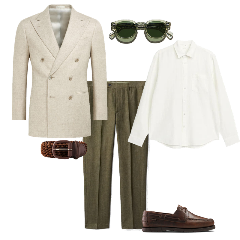 A khaki blazer can take evening and event looks to a more stylish place. This season, linen is a smart choice for a lighter look and feel – look to brands like Percival, Gant and Mr P. for options.