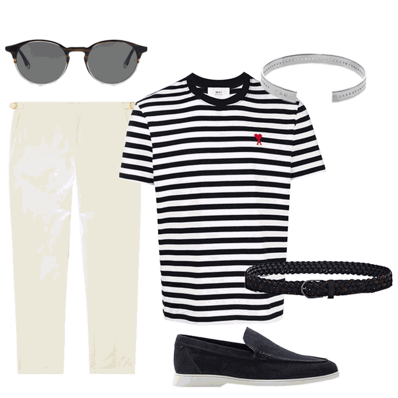 This is what summer in the city’s all about. Whether it’s a warm day on the go or you’re going into a relaxed office setting, pair a more formal style of white linen trousers with a casual tee. Suede loafers and a robe belt offer smarter touches, while a silver bangle adds a cooler edge.