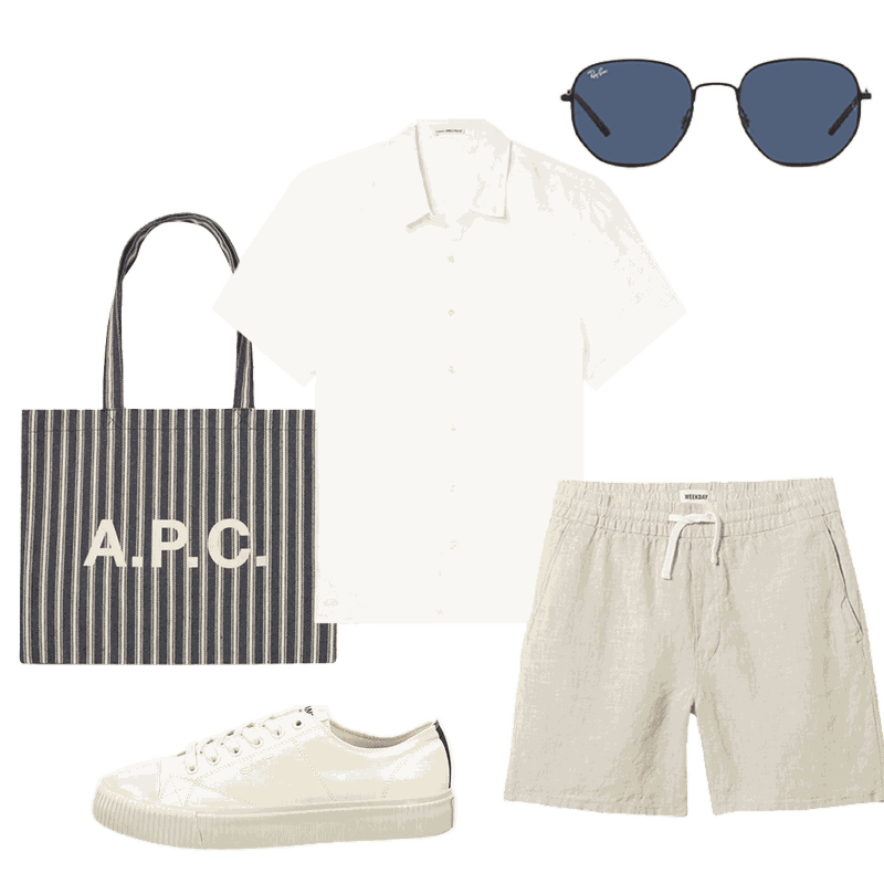 Go double linen for a laid-back yet sophisticated take on the timeless combo. The boxy striped tote from A.P.C. makes for a beautifully natural pairing. Complete the look with sunnies and your favourite white trainers.