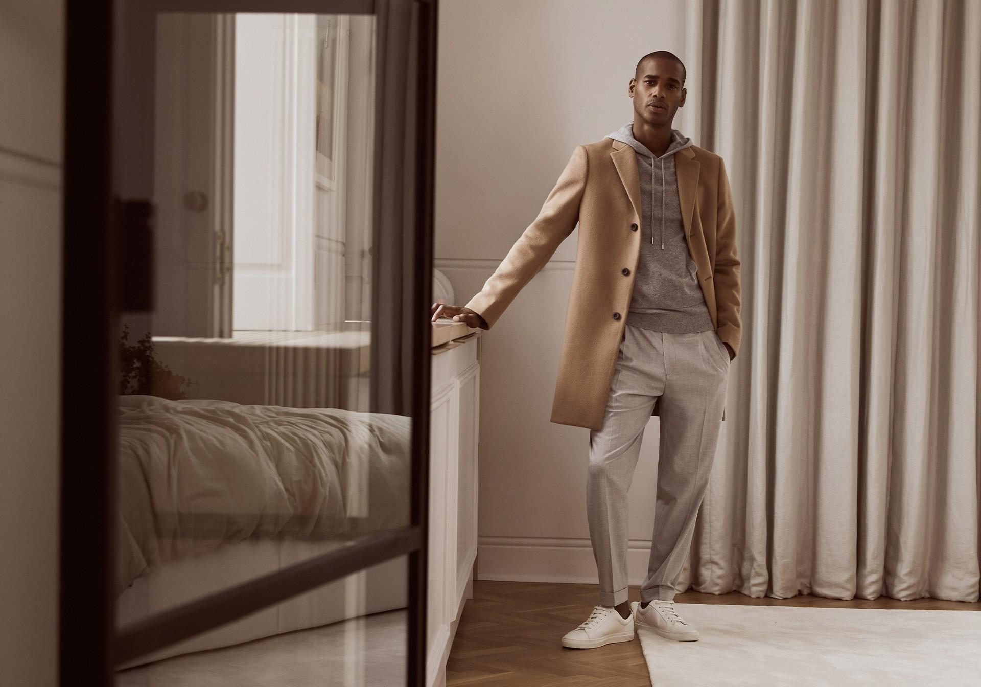 Consider this a simple, comfortable weekend look you can easily replicate. Box fresh trainers and a slick crombie coat elevate relaxed trousers and a cashmere hoodie.