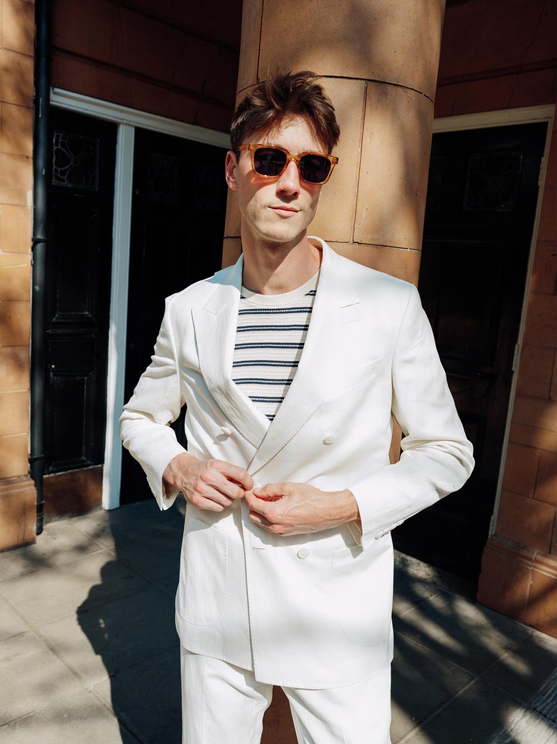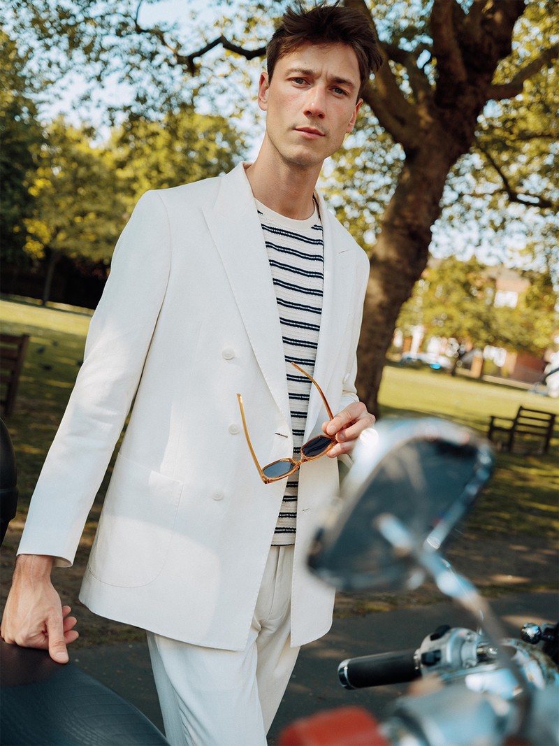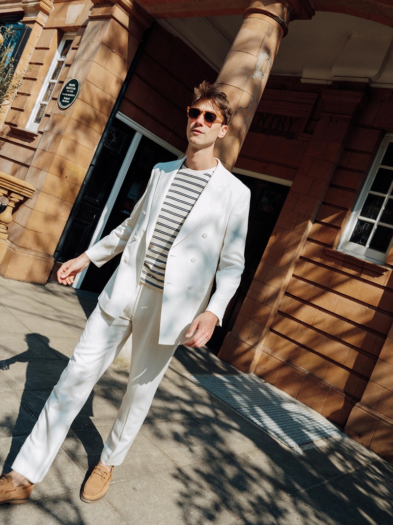 Light, breathable and timeless, a white linen suit is the ultimate summer statement. Paired with a striped tee, it feels modern and laidback – proof that tailoring doesn’t have to be formal.