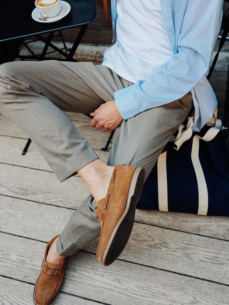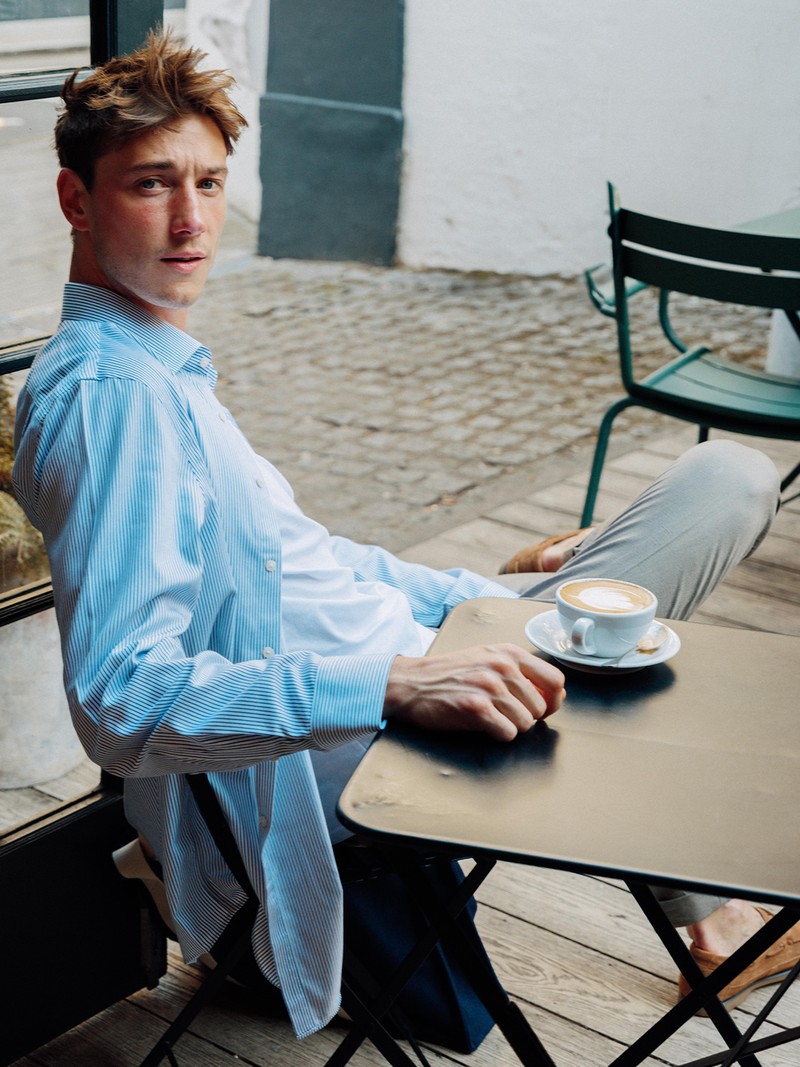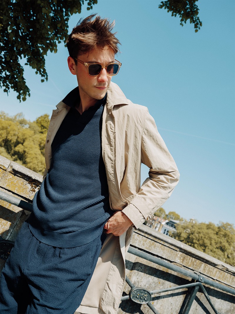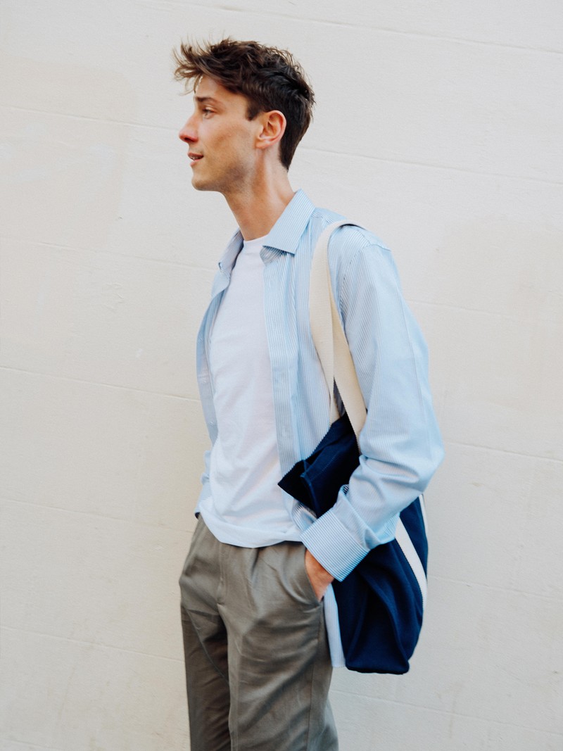 Classic doesn’t have to mean predictable. A denim overshirt, crisp white trousers and a marl grey tee keep things casual and effortless.