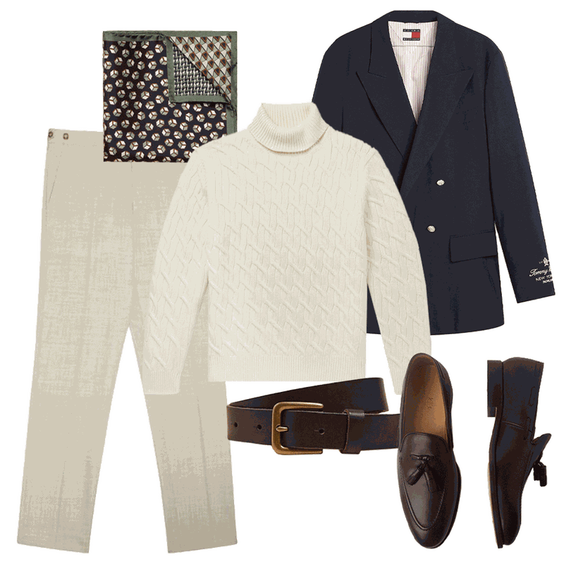 Elevate the look with a navy double-breasted blazer. Brown leather accents – loafers and a belt – add polish, and a fun pocket square injects a little interest.