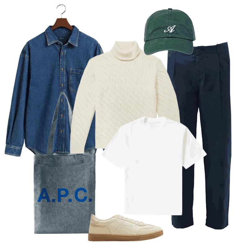 Take this knit off-duty by teaming it with cropped navy chinos and a denim shirt. Sling it over your shoulders, or pop open the shirt buttons and layer it underneath. A cap, trainers and a tote complete the look.