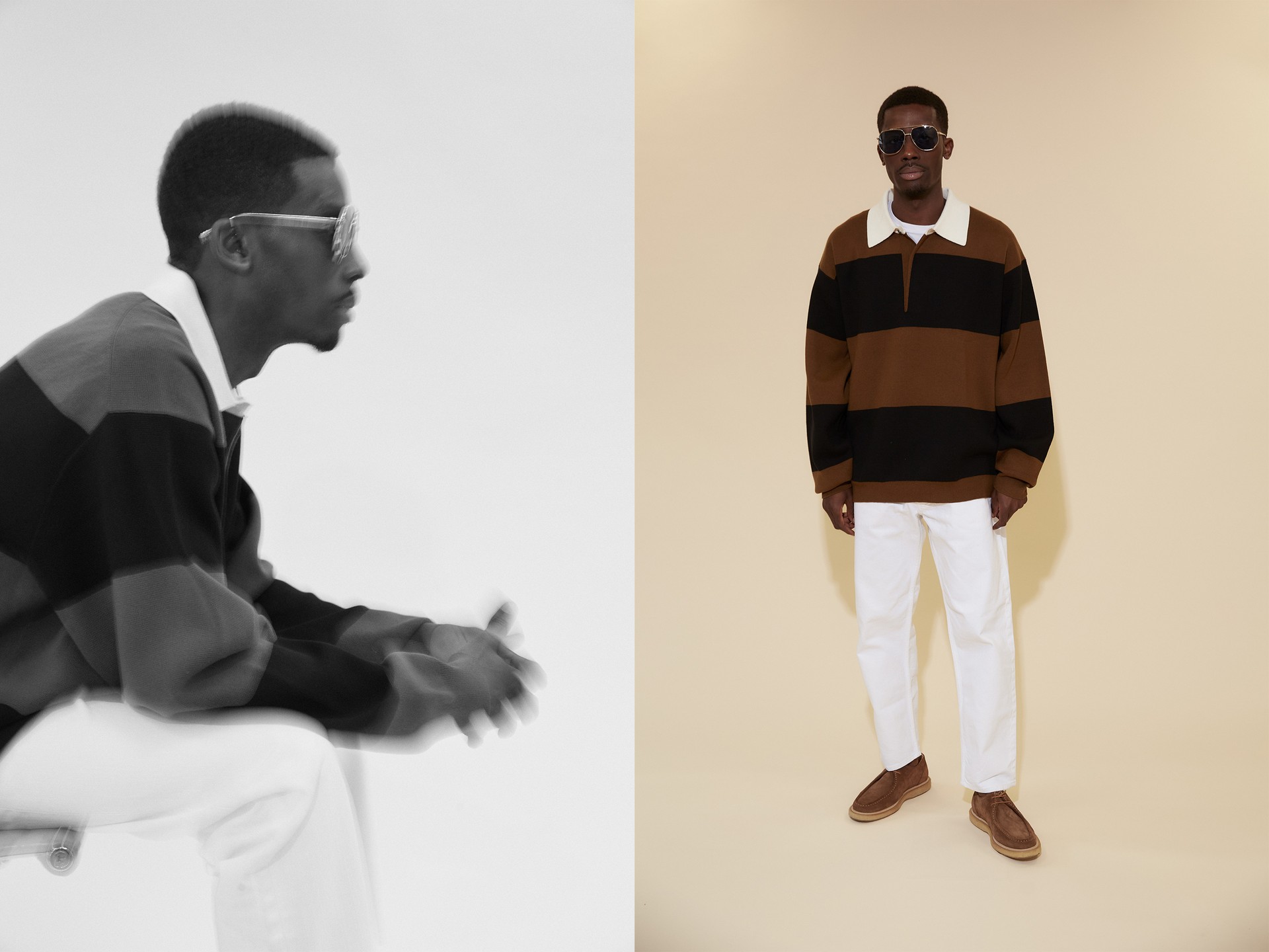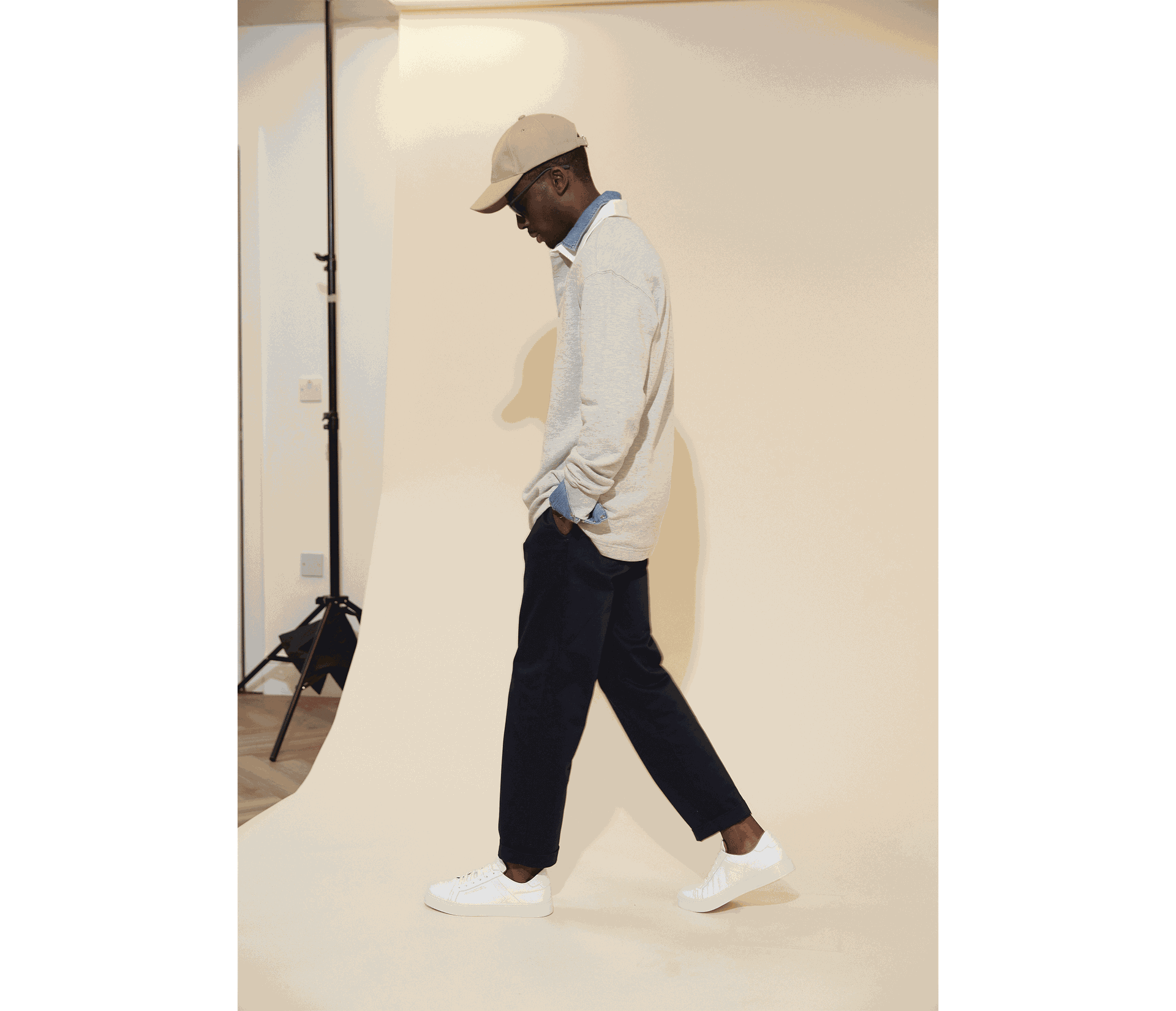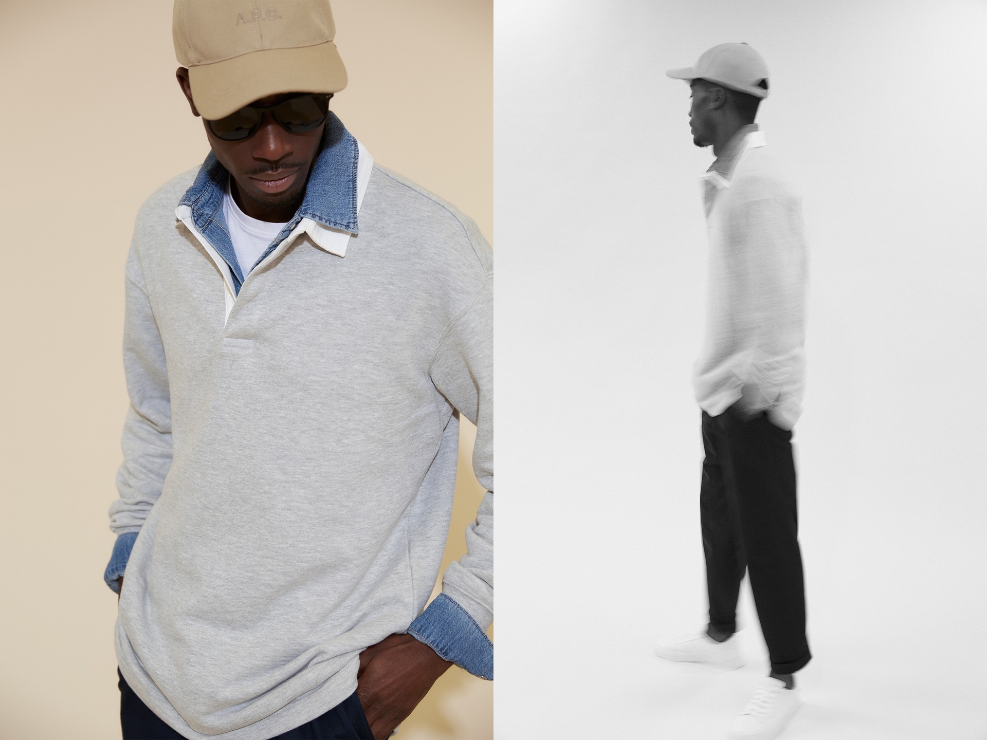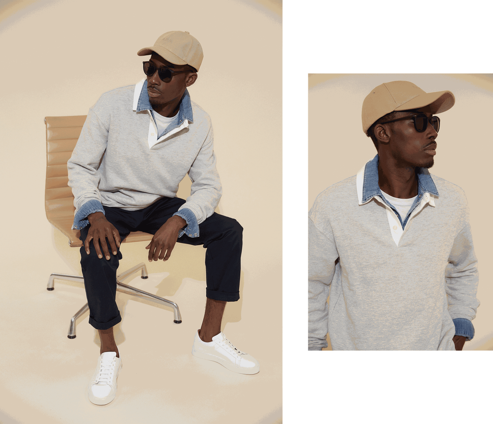 “Loose chinos, fresh white trainers and a simple cap are the perfect partners for a modern rugby shirt.”