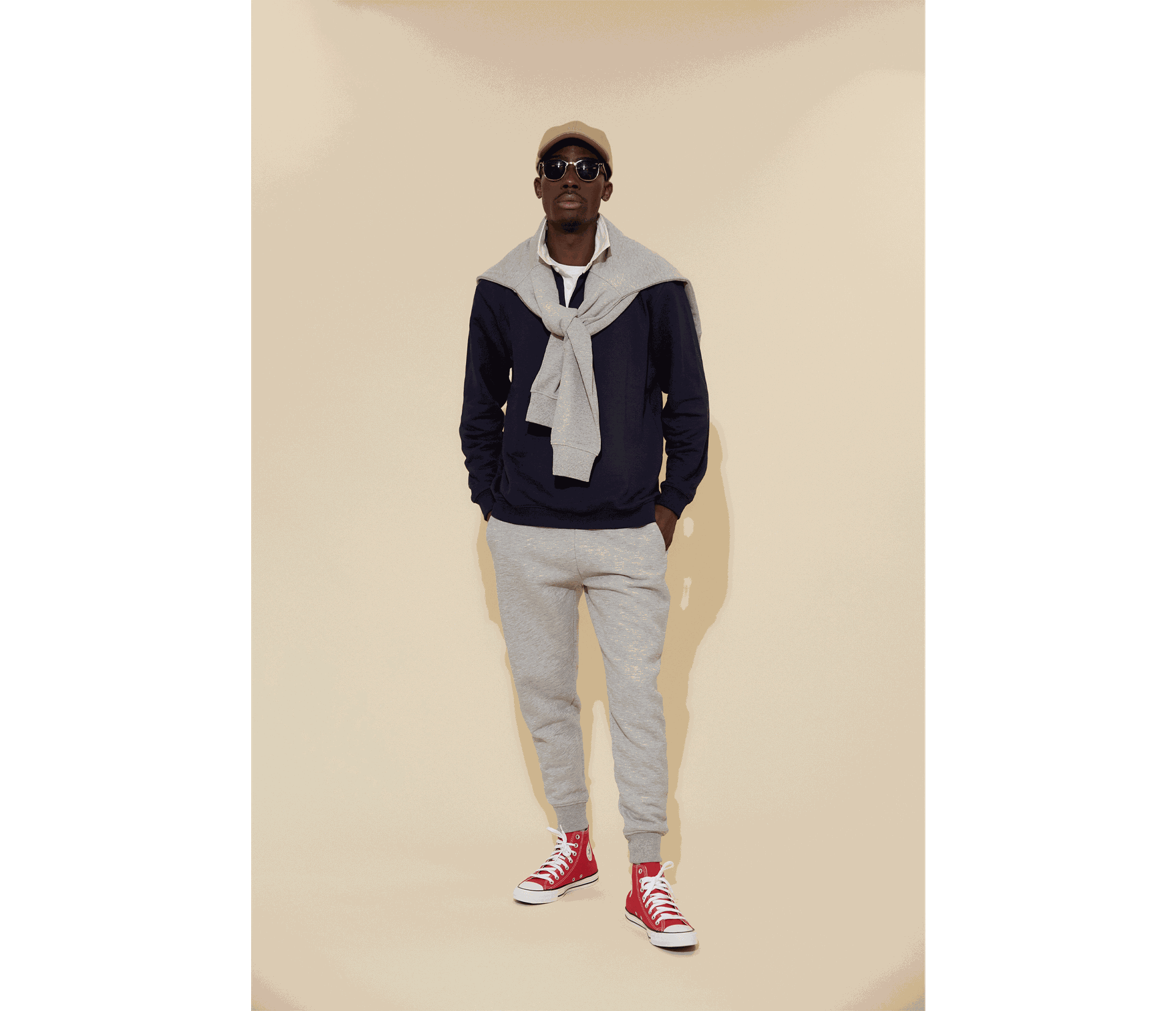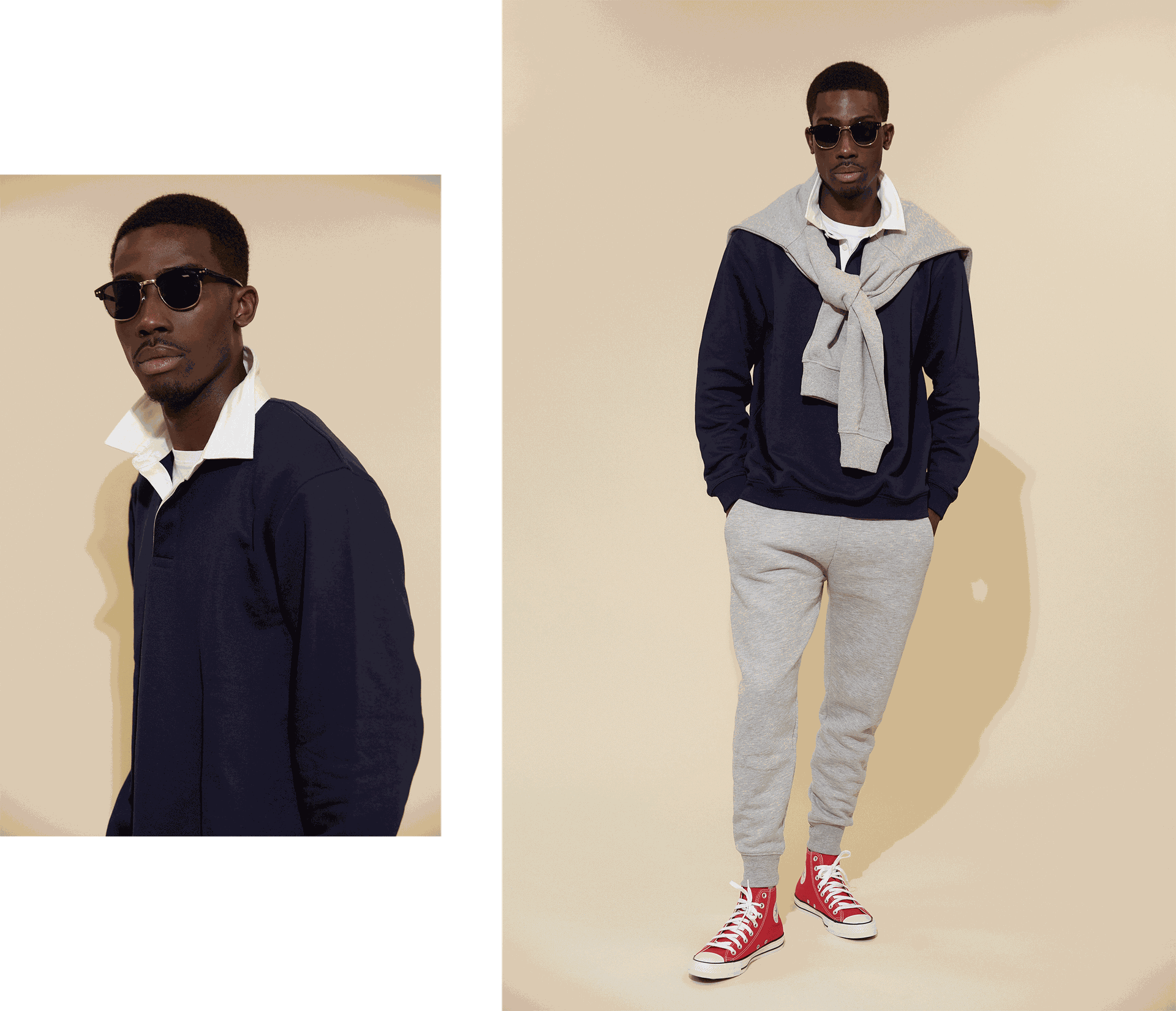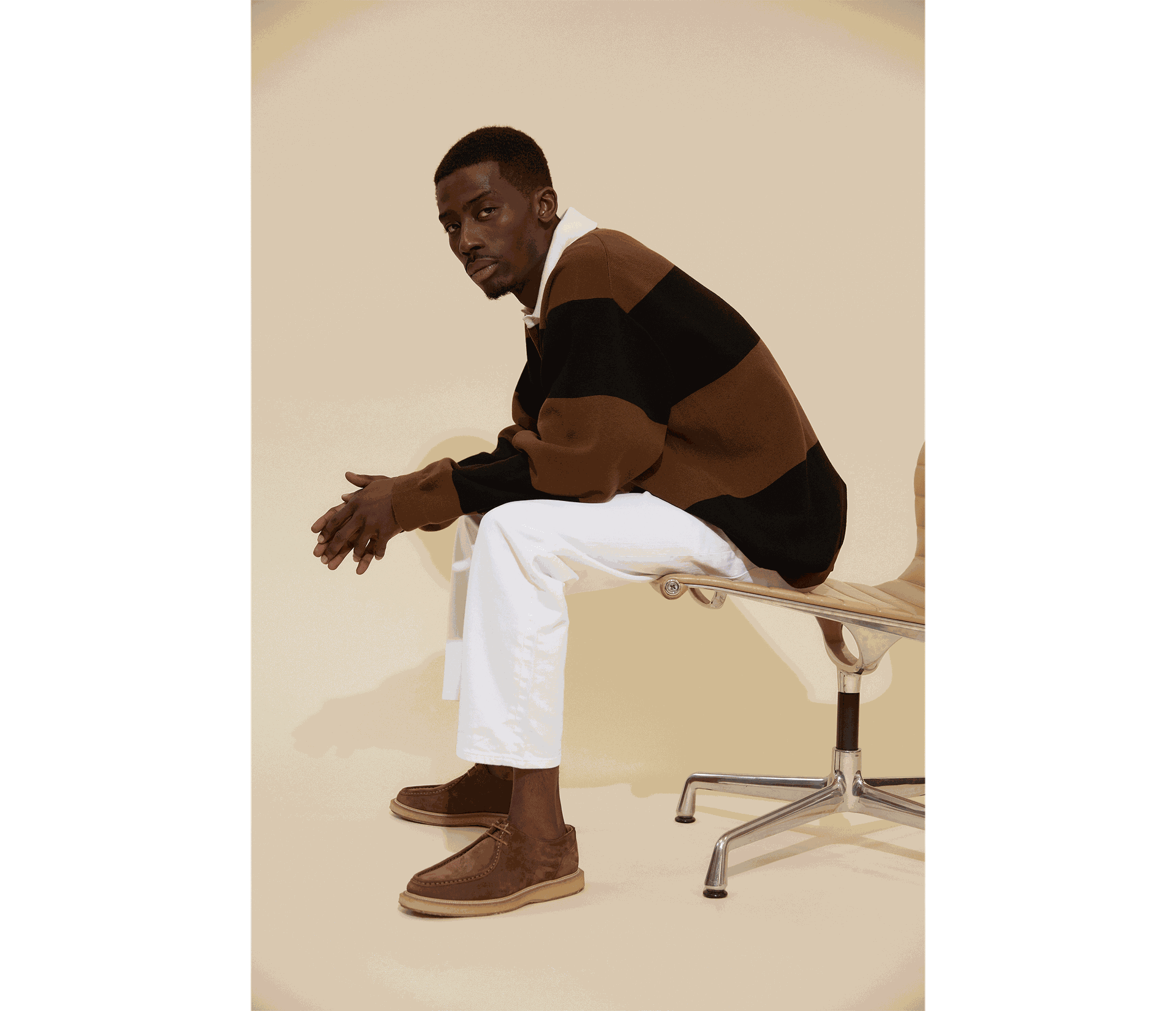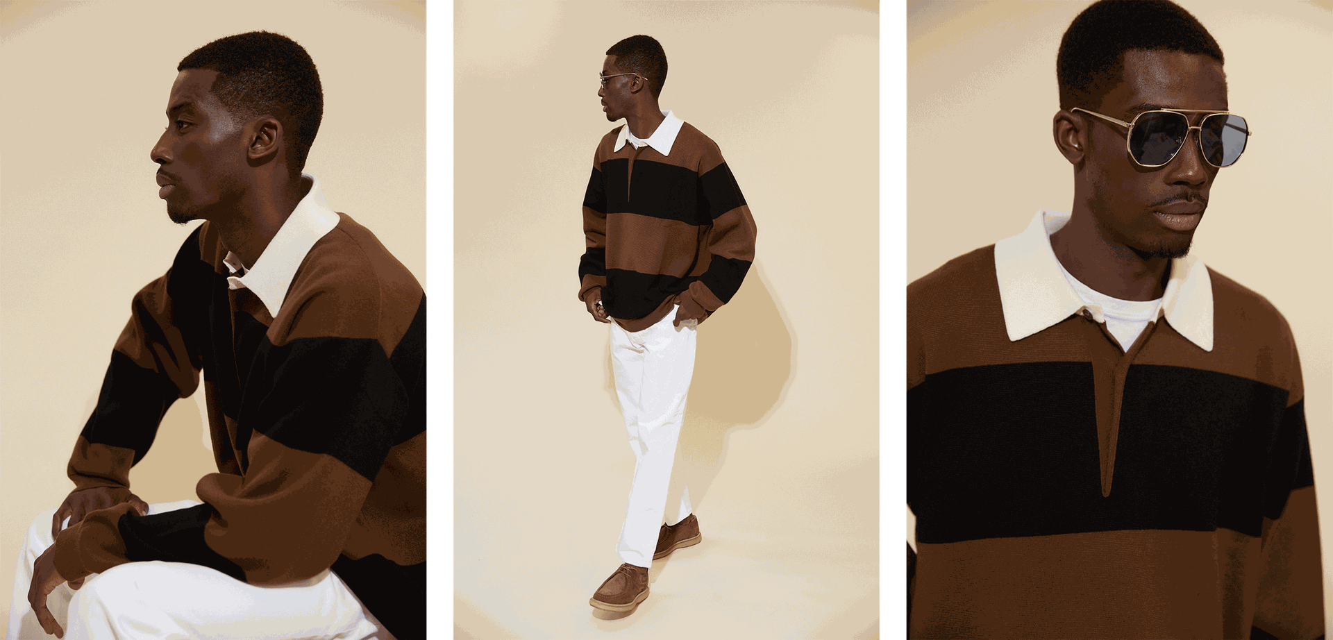 “Loose chinos, fresh white trainers and a simple cap are the perfect partners for a modern rugby shirt.”