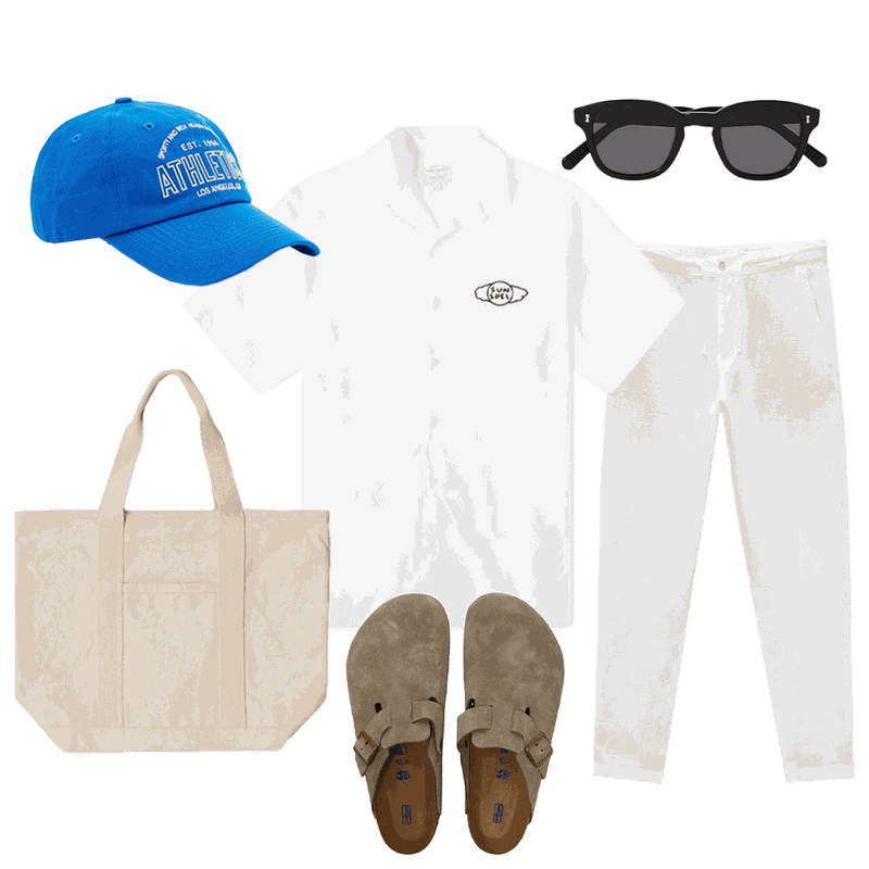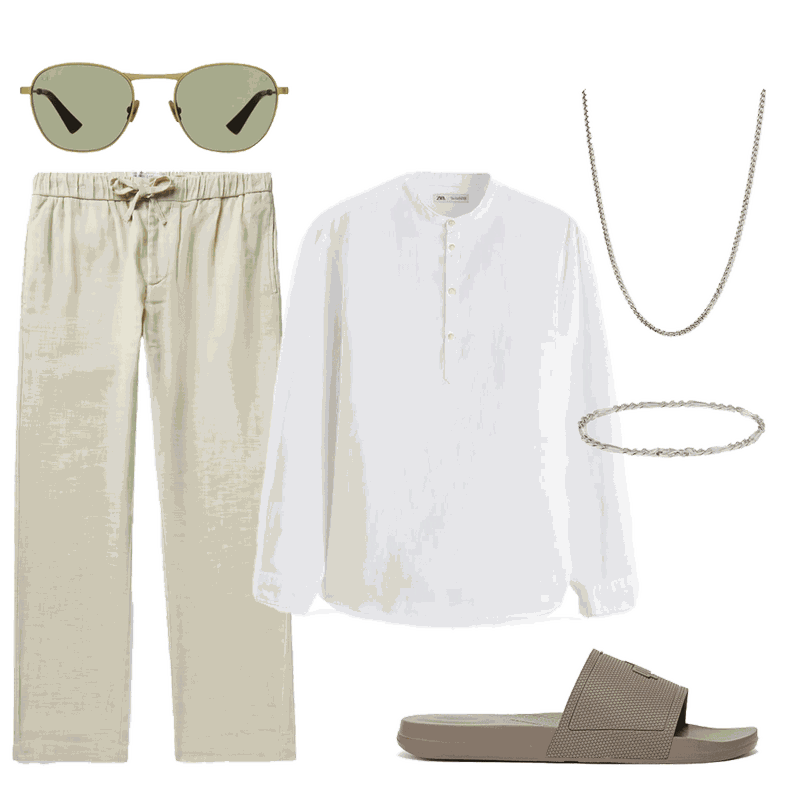 Here’s how to do laid-back holiday dressing. Kanaan’s relaxed linen look is comfortable and stylish. Simple slides and some sunnies are natural accessories, but you can just as easily style this type of look up for the evening with a loafer or smart trainer.