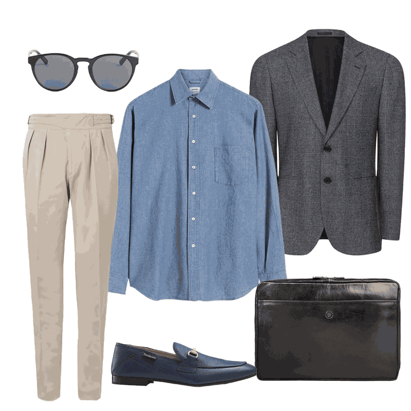 This sophisticated look works as well for warm office days as summer events. Light trousers and a chambray shirt keep the look grounded, while the fits ensure you’ll pass any dress code. The single breasted blazer is a considered touch.