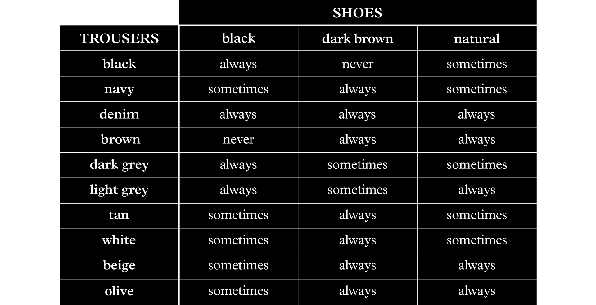 There’s so much conflicting advice on this topic, no wonder we have problems knowing what’s what. To solve them once and for all, I’ve devised this handy trouser colour matching matrix. For example, please note that it’s never acceptable to wear light brown or tan leather pointy shoes. With anything. Ever.