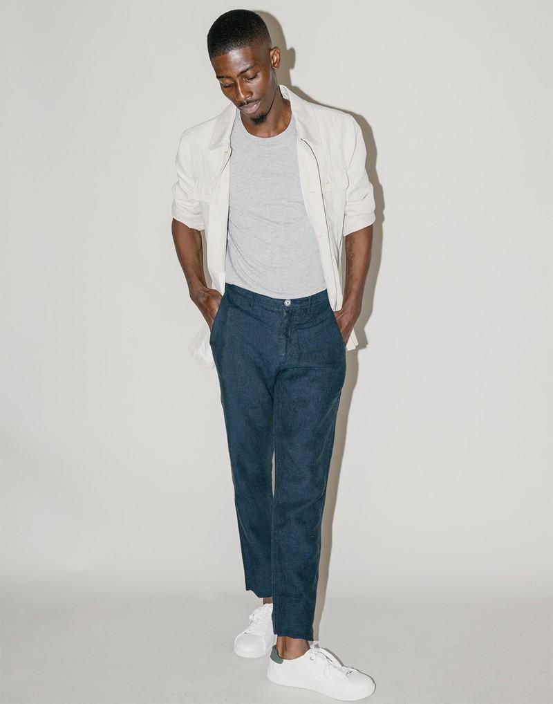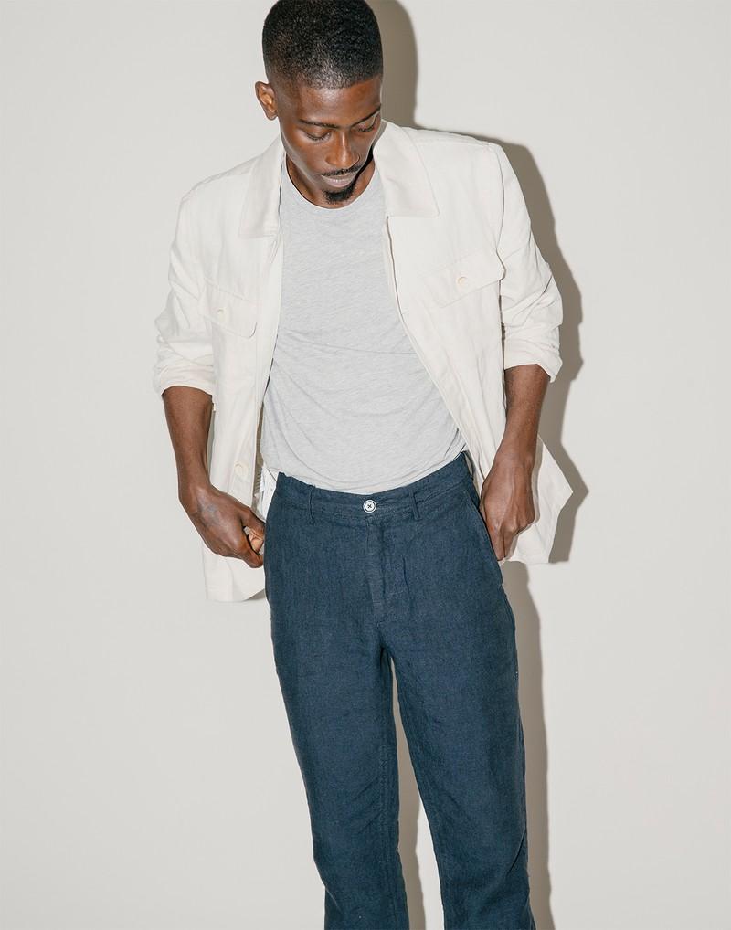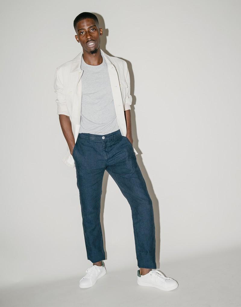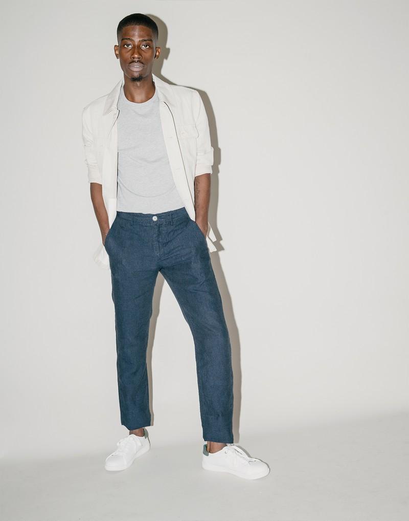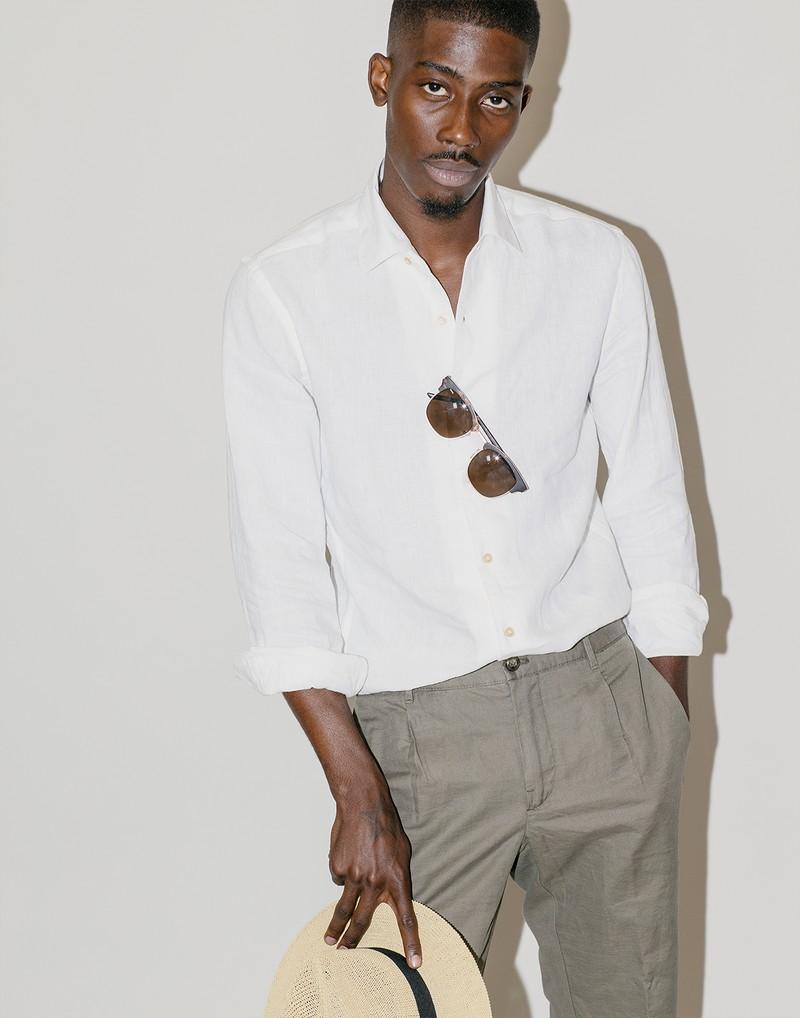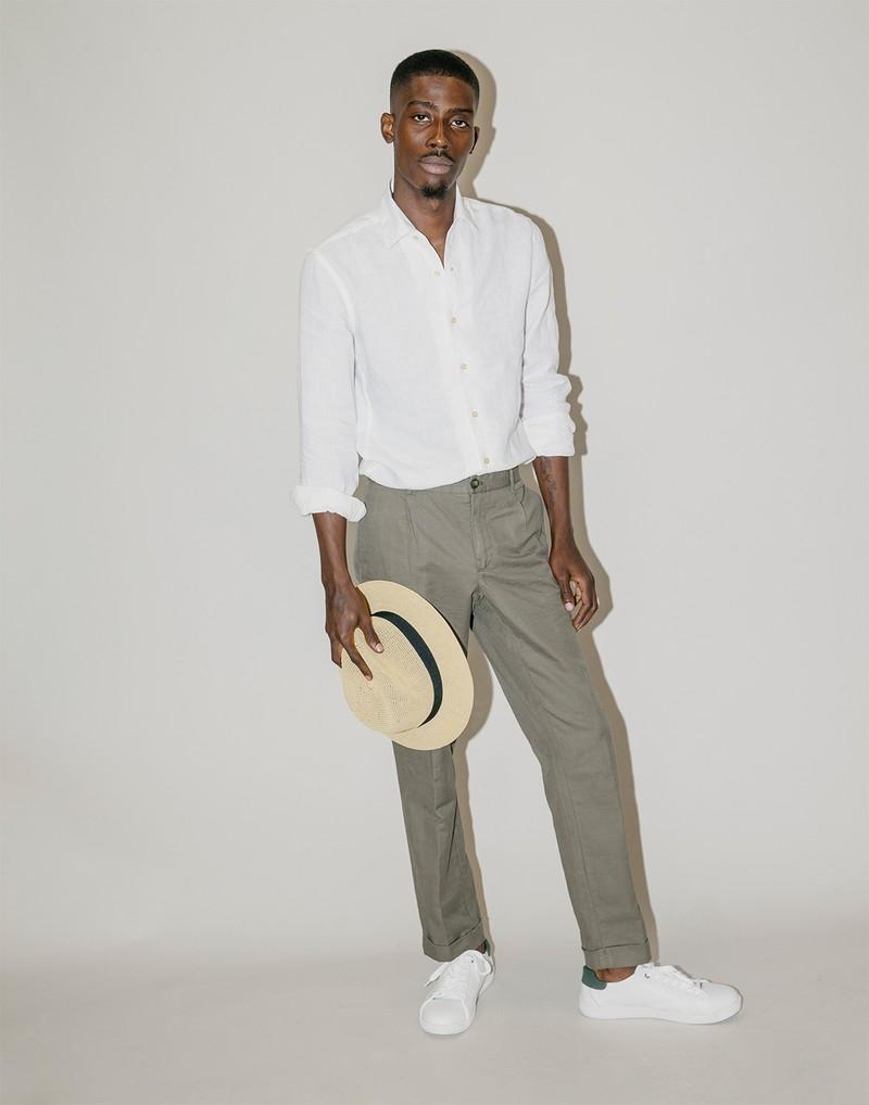Slim fitting chinos and a linen shirt combined with white trainers and a trilby is modern, fresh and cool all at once.