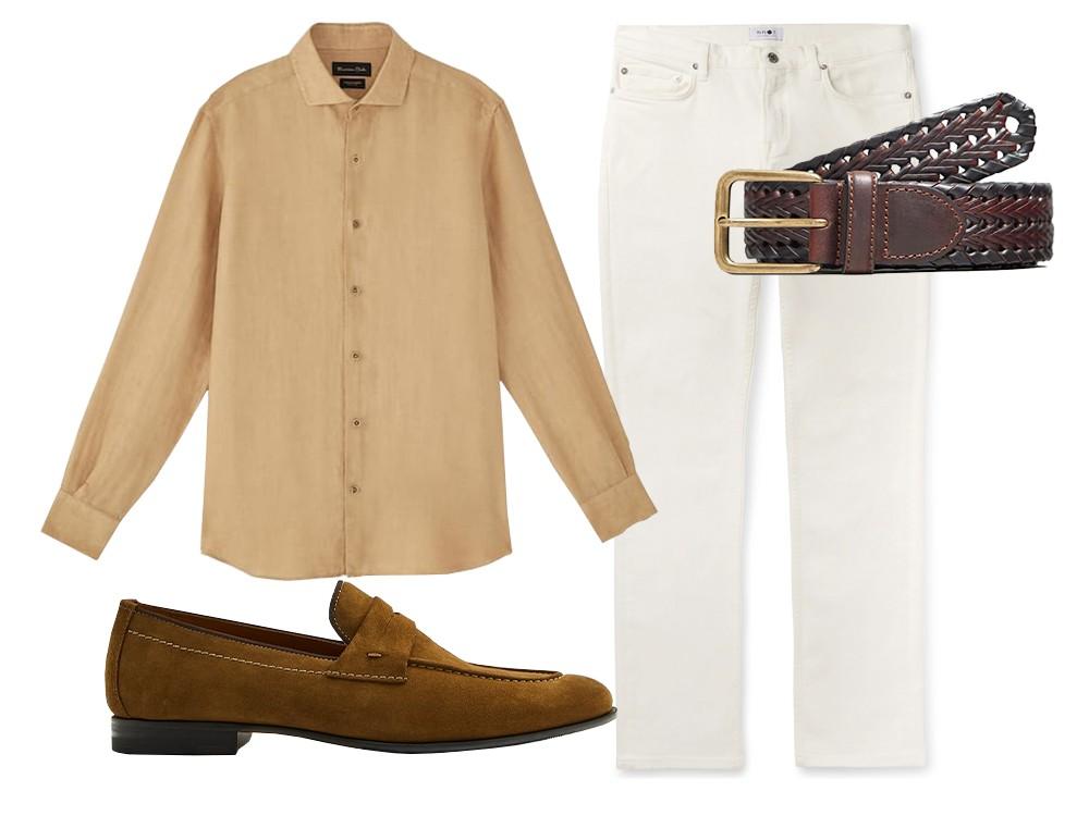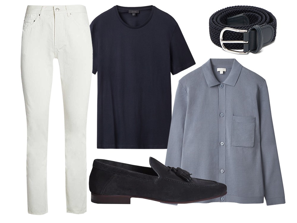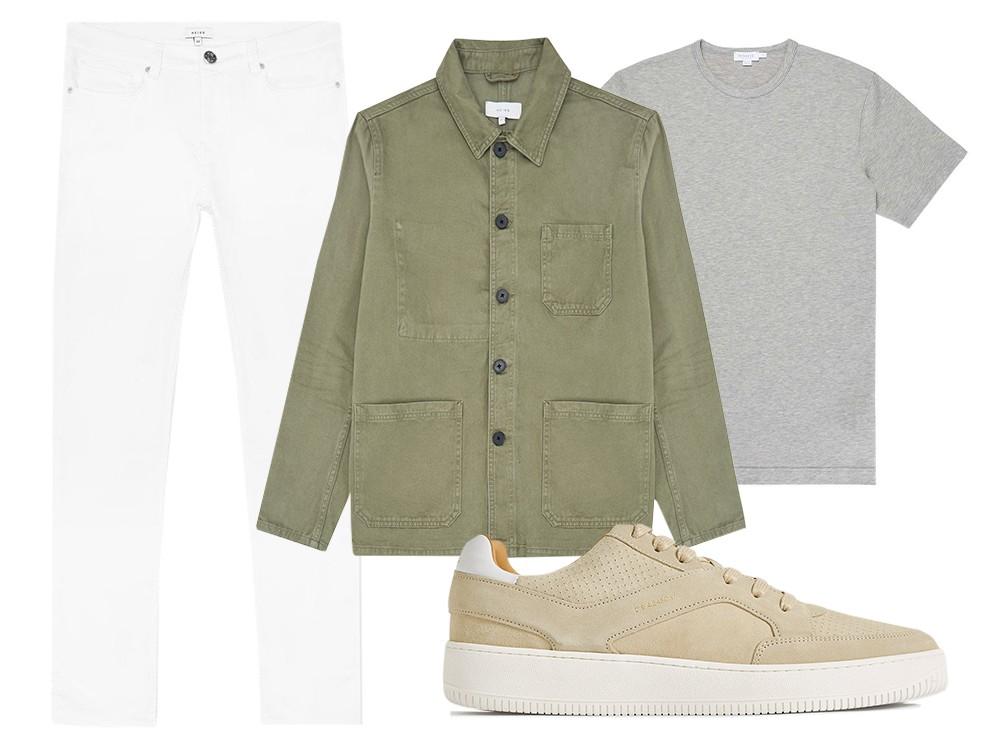 Sticking to light, tonal colours is essential for a pulled-together look. Light greys and khakis will stop the stark white of your denim from standing out too much.