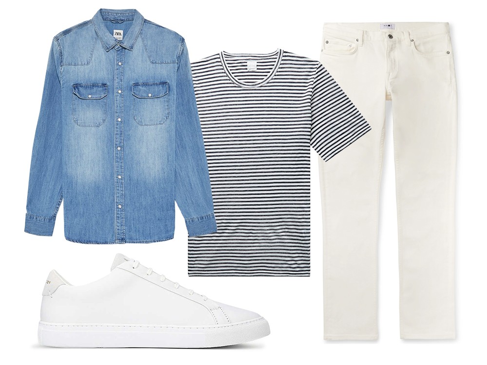 Channel your inner Parisian in this cool, effortless look. Breton + denim shirt + white jeans = an easy, everyday outfit.