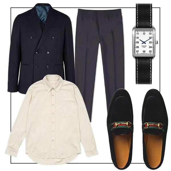 It should be relaxed but refined. I think the most important thing is to look comfortable but not swallowed up. If you only own one suit, you can’t beat a well-cut single-breasted jacket, but I think a double-breasted style looks great – especially worn with a polo or simple tee under it. If I was attending a smart event, I’d wear tailored trousers with Chelsea boots, with a nice knit and a double-breasted jacket. For all-out glamour, you can’t beat a Tom Ford black tuxedo.