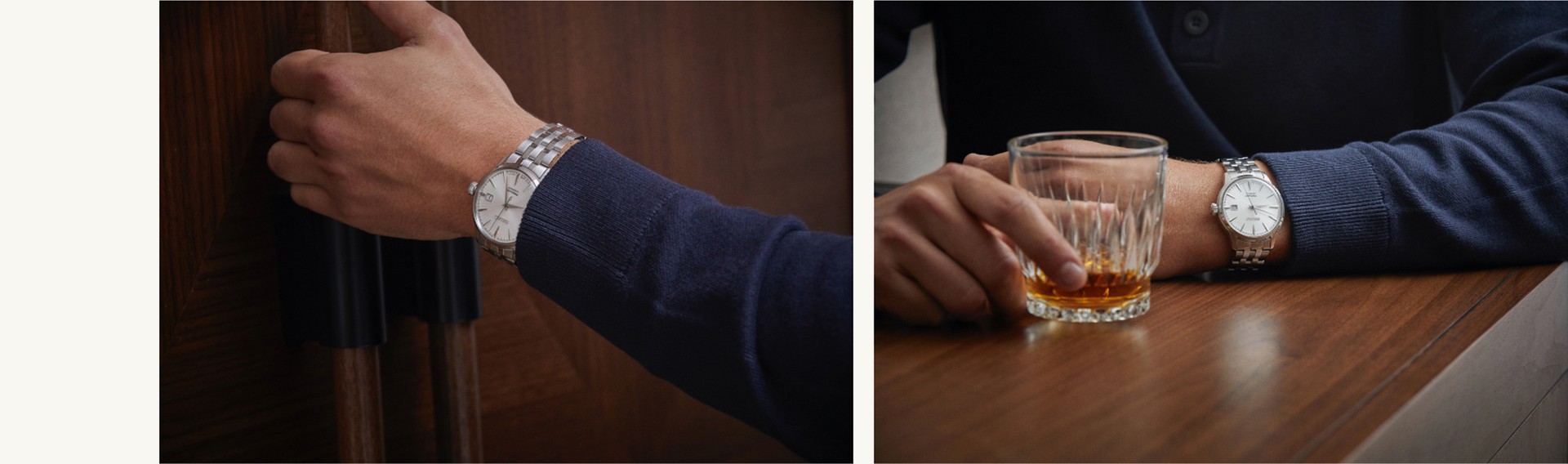 "A clean face, slick leather strap watch will elevate any look. Pair this elegant style with a crisp white shirt."