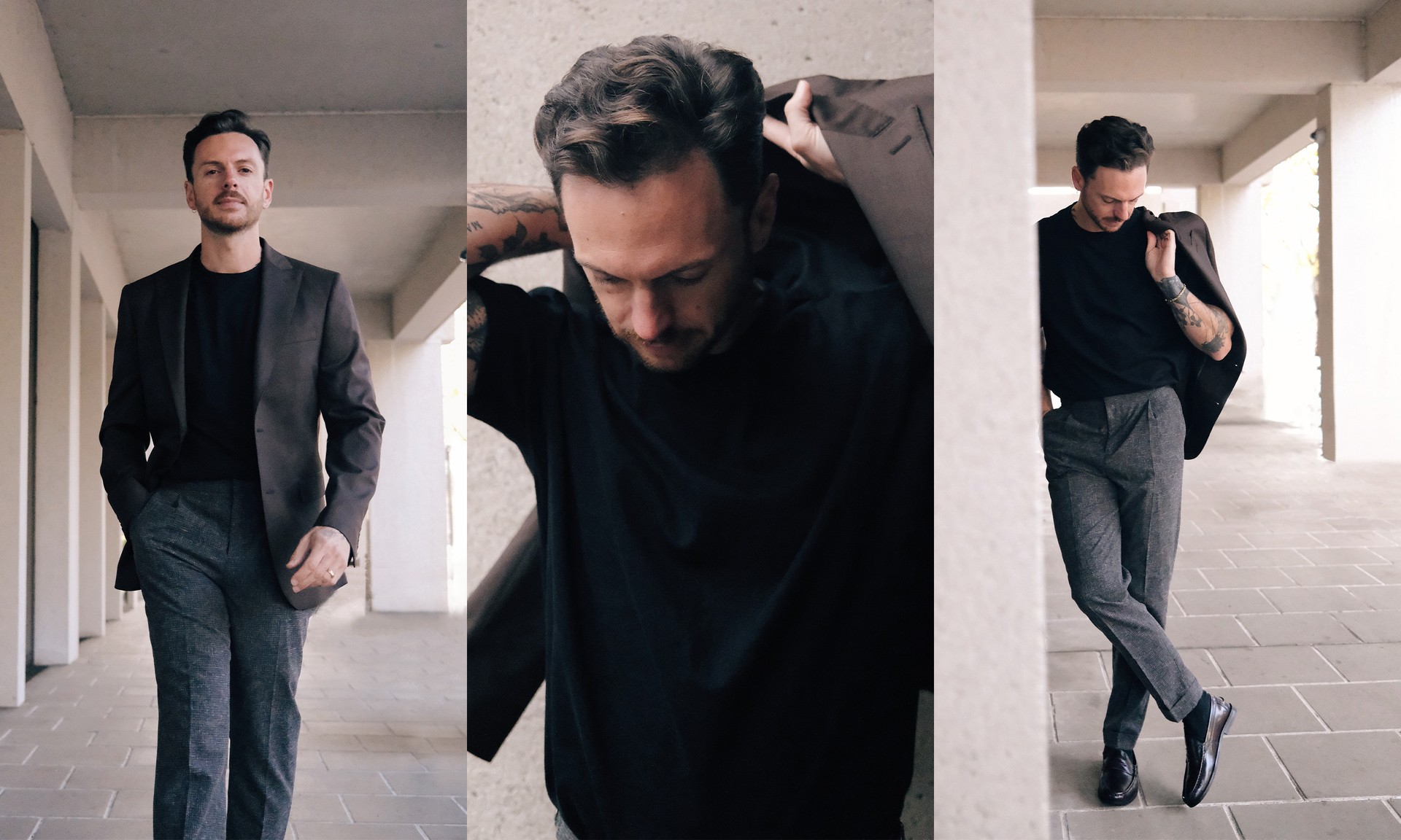 Relaxed tailoring with a simple round neck t-shirt are game-changing during party season. Much cooler than a formal suit and easy to mix and match, just add a penny loafer for a more sophisticated look.