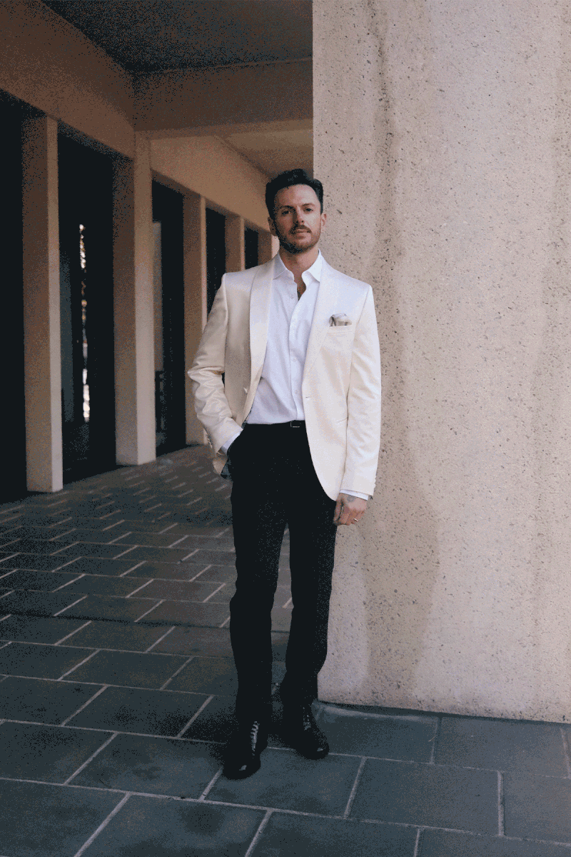 Pairing a satin shirt with a satin tuxedo blazer adds a touch of luxury. Leave the collar open for a contemporary alternative to a classic bow-tie, while mis-matched tuxedo trousers and a classic brogue add cool contrast.